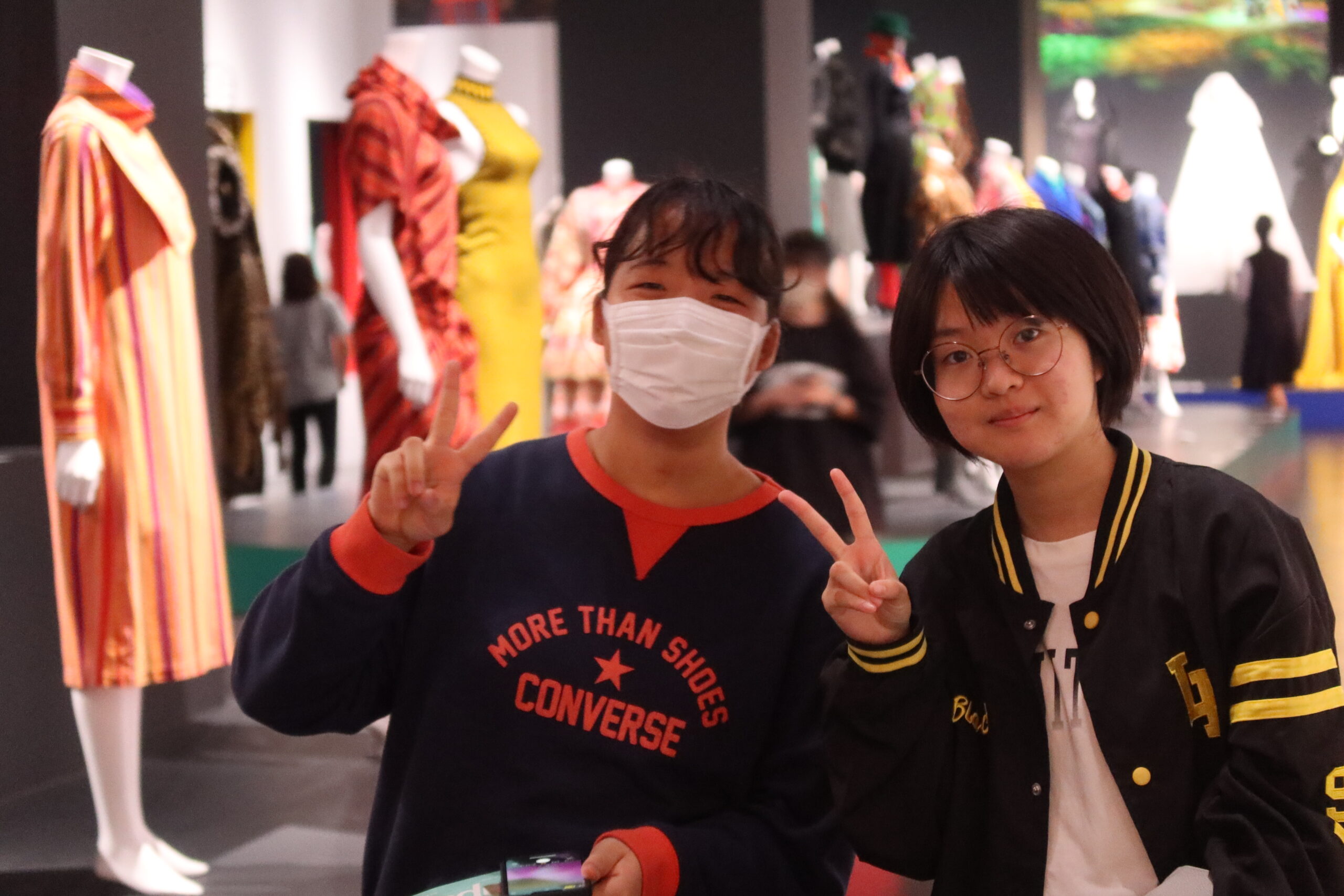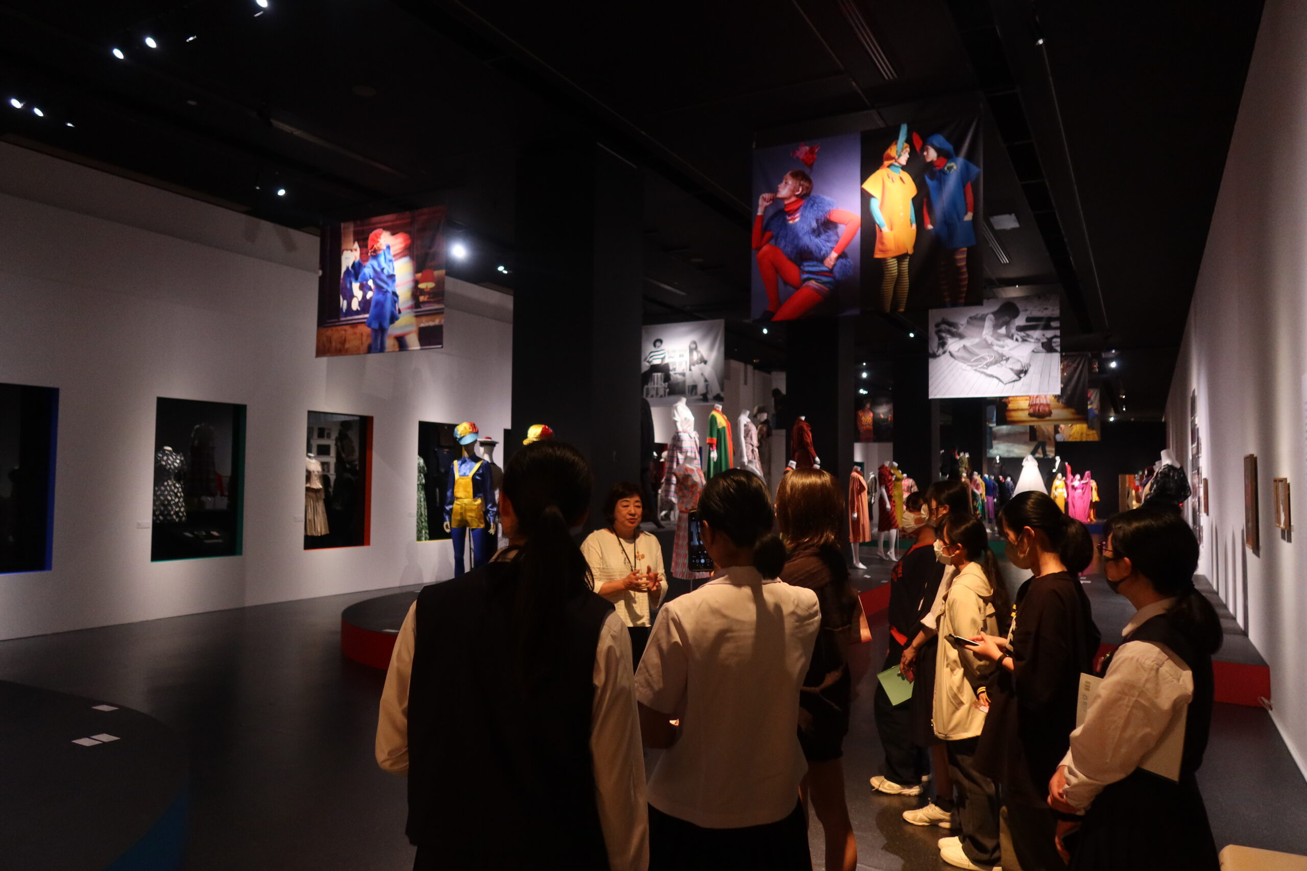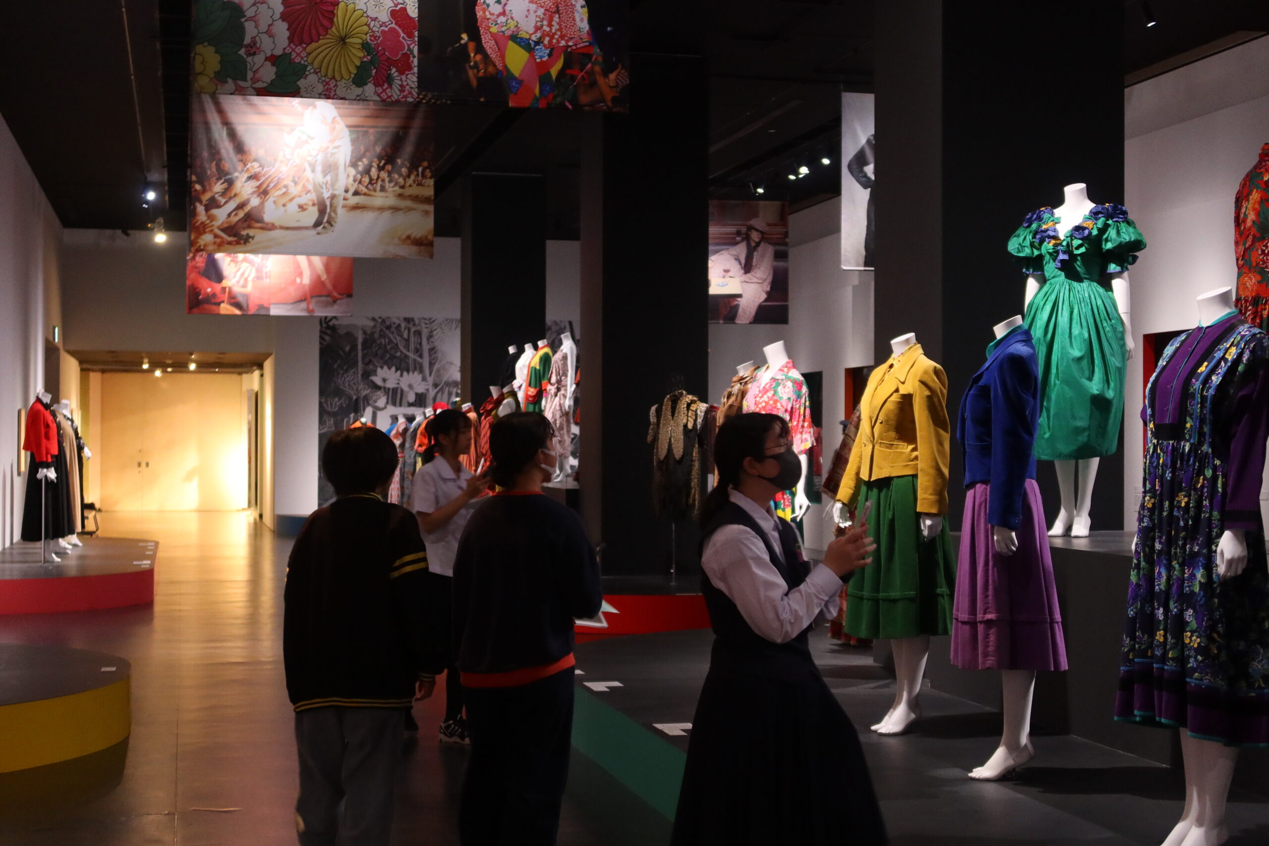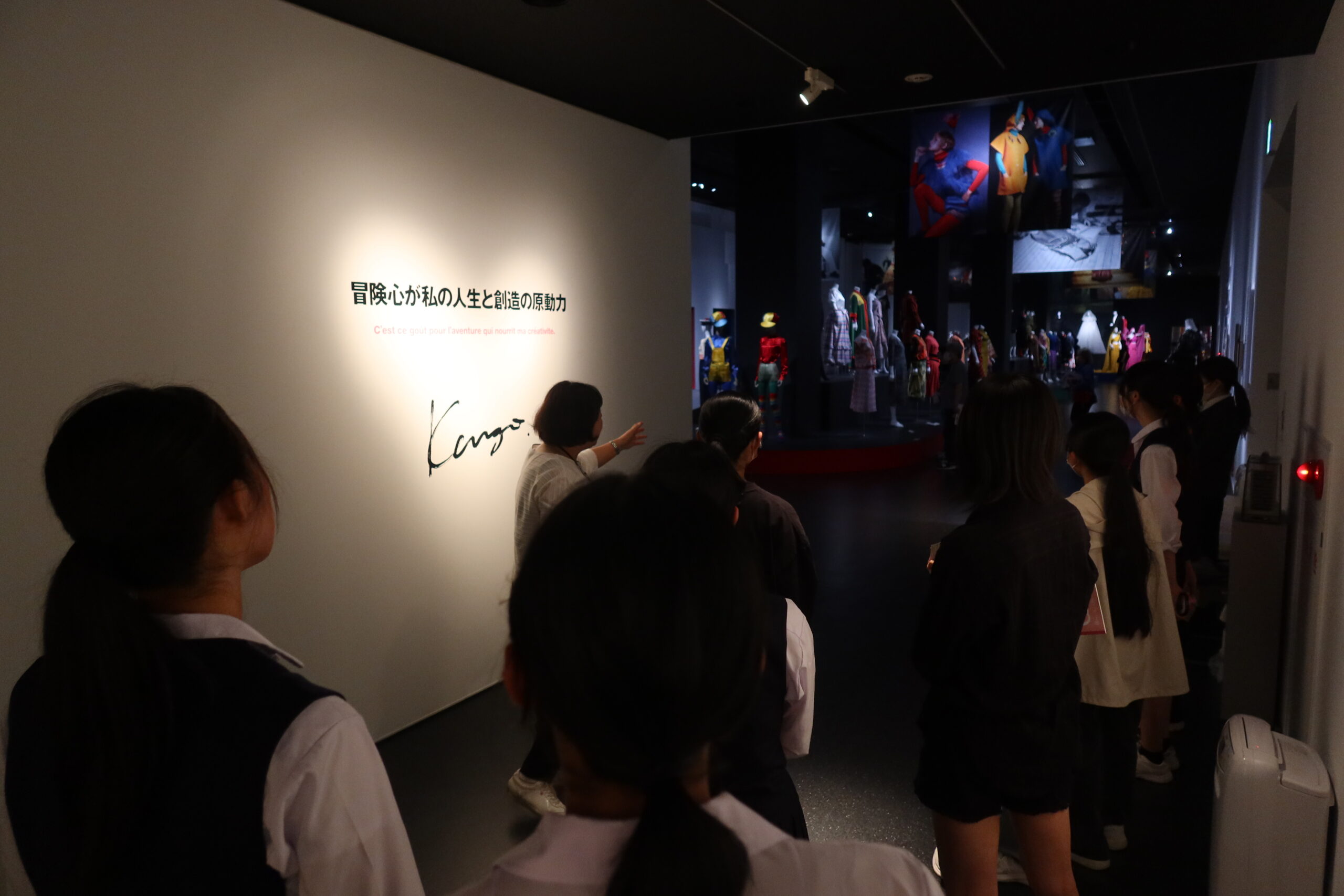 展示スペースに入ると、色彩の魔術師と呼ばれている髙田賢三氏がデザインした色とりどりの衣装の他に、建築模型や衣装スケッチ、実際のショーの映像などとても見ごたえのある展示が多く、生徒たちは思い思いに作品を鑑賞していました。