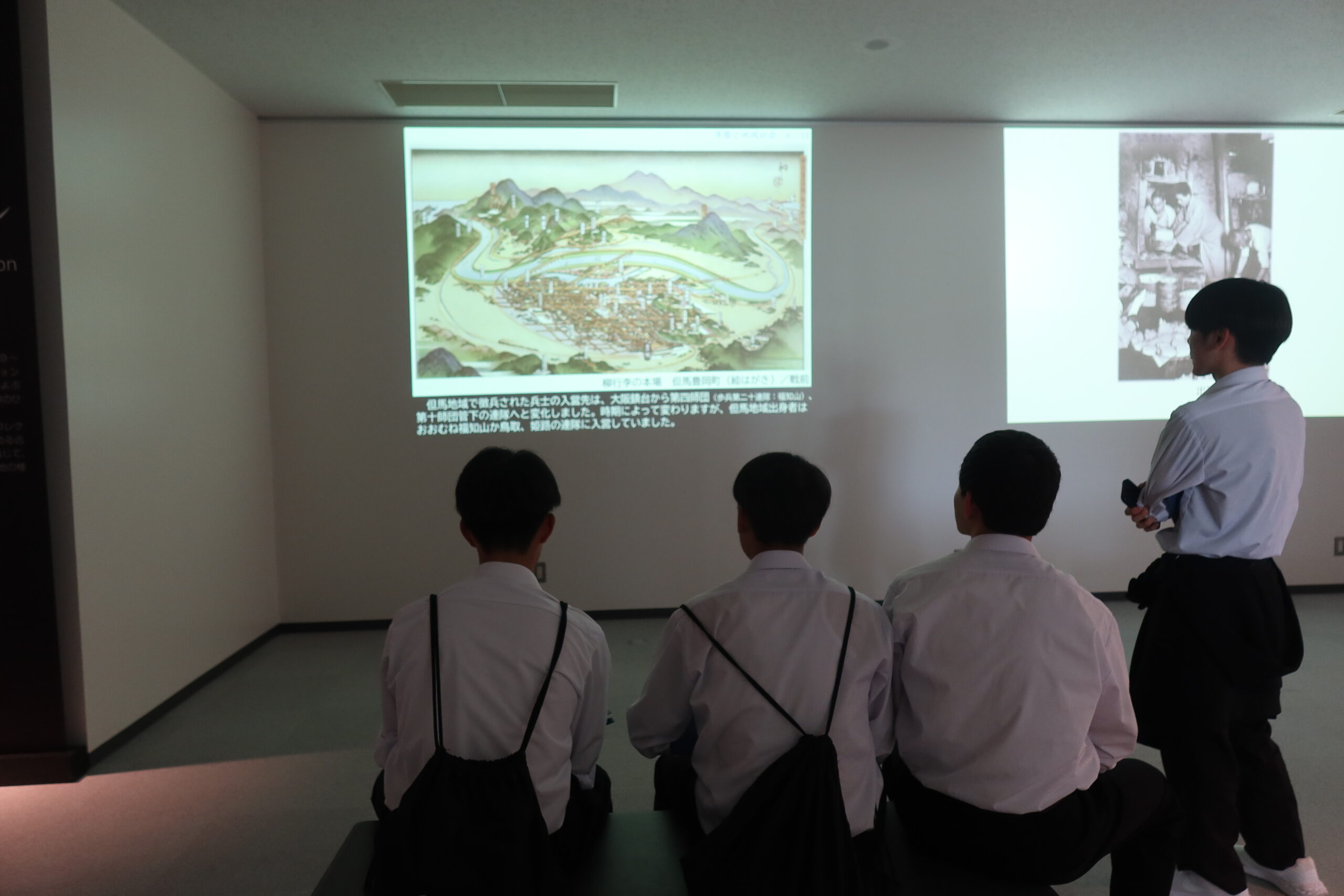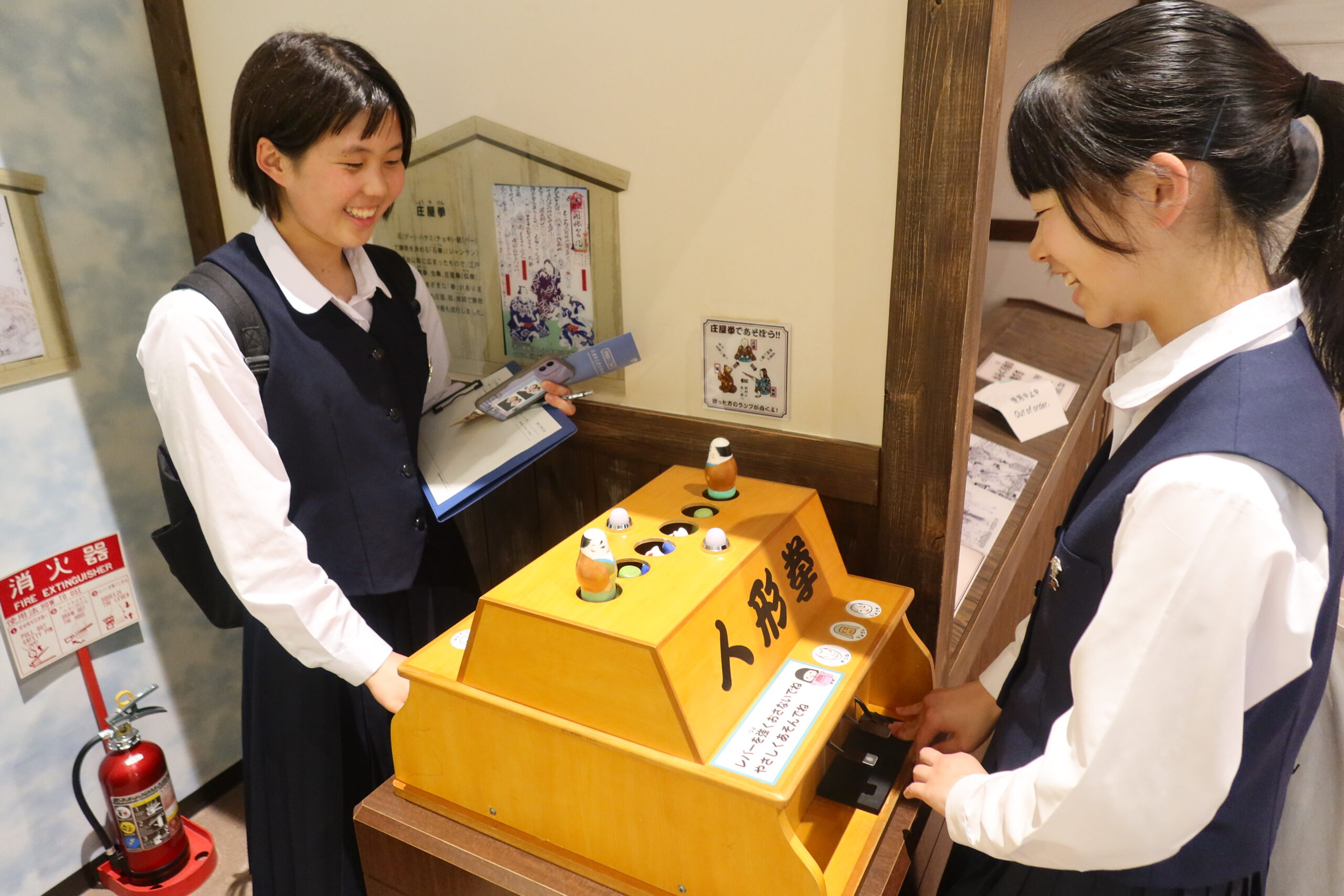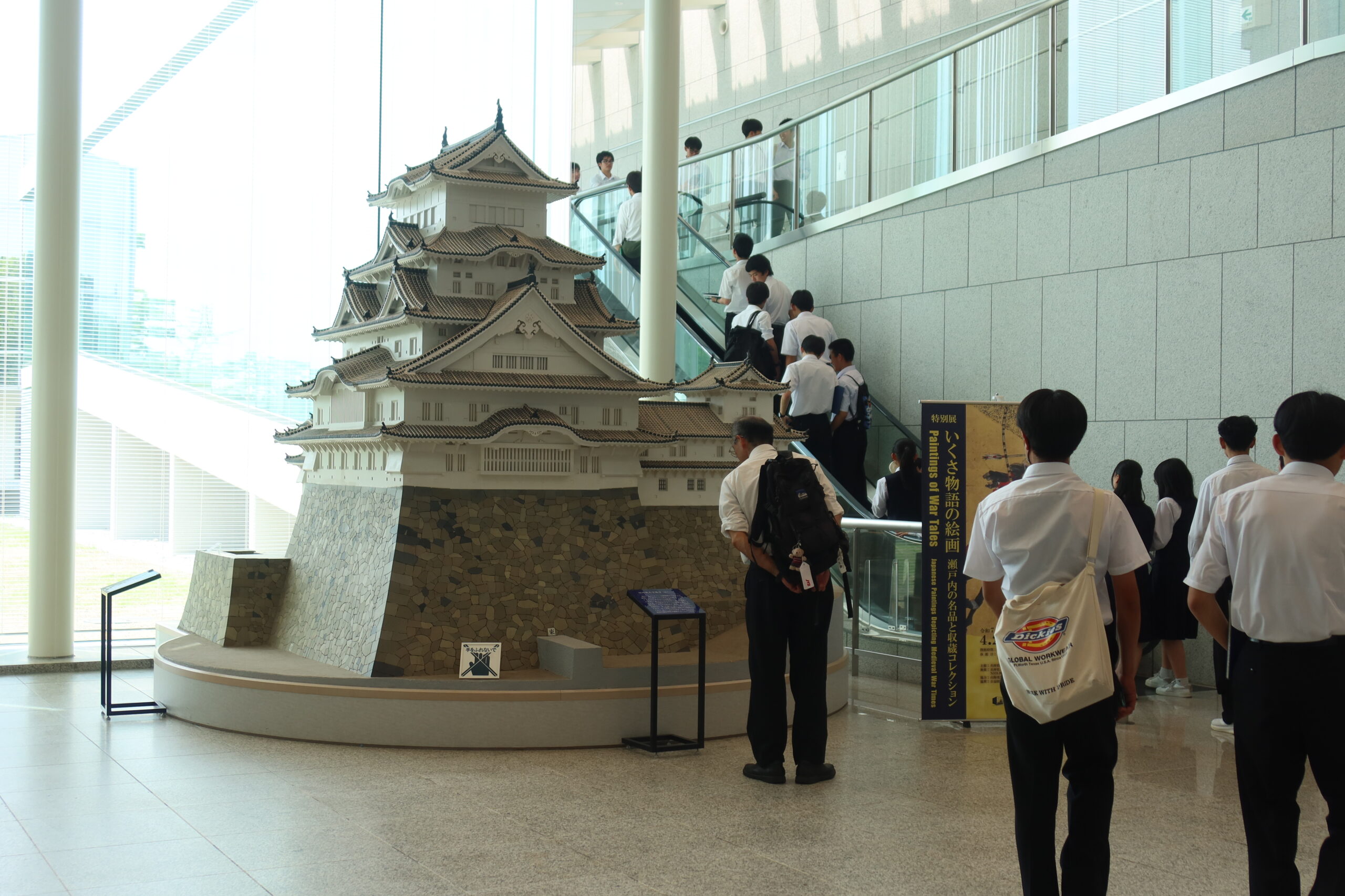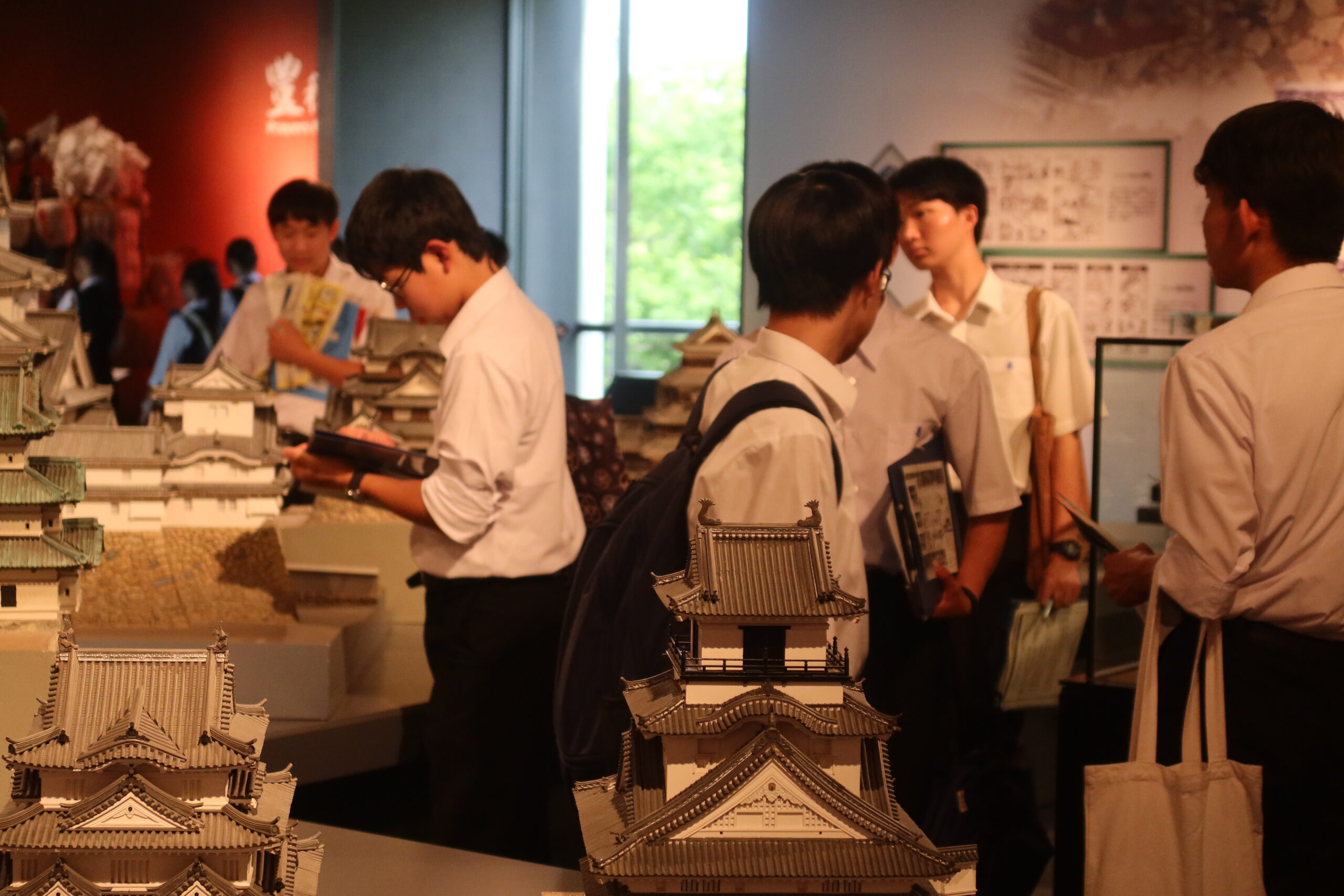 特に、現在の特別展「いくさ物語の絵画」や、常設展示の「現存12天守」と徳川家光によって建設された「寛永度江戸城天守(3代目)」をすべて1/50スケールで再現された「日本の城大百科」には、多くの生徒が集まり、思い思い感じることや、歴史の知識を共有しながら観察をしていました。「ひょうごの祭り」では地元の祭りの文化を紹介し合ったり、「みんなの家」では昔の遊びを体験したり、「美術とくらし」では昔の電話や洗濯機といった生活道具を観察したりと、展示物に興味深く向き合っていました。今日は、どのような「探検記録」が仕上がるのかを楽しみにしています。