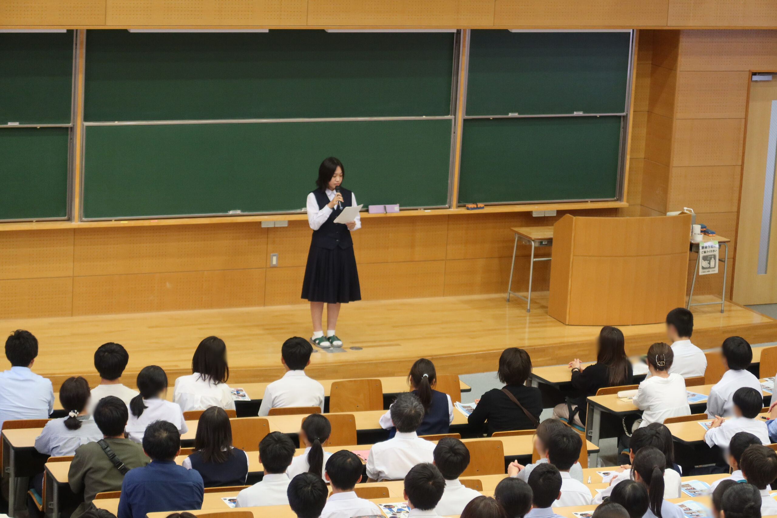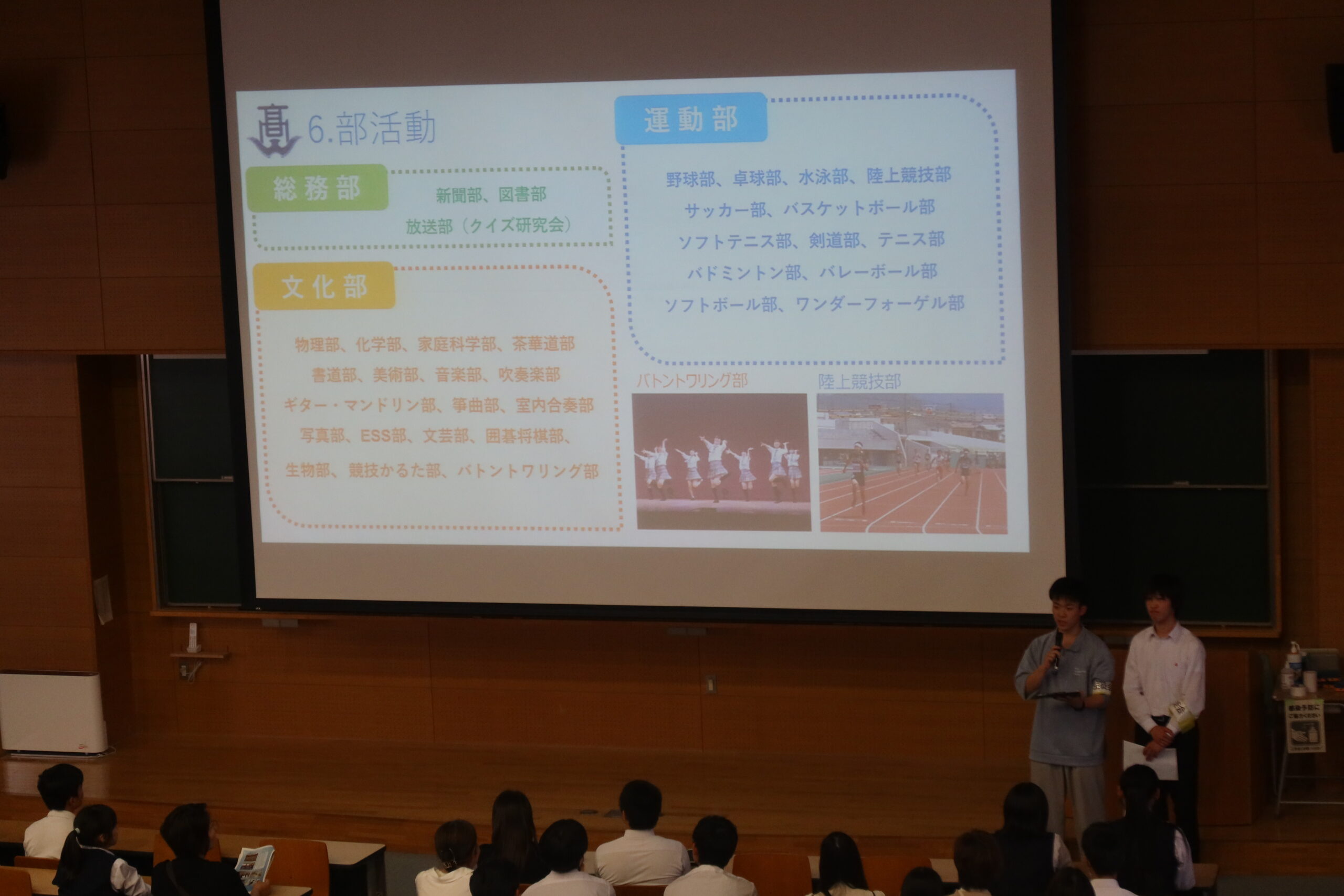 代表生徒による普通科と国際理学科の紹介や、生徒会による西高生の1日を追った学校紹介が動画を交えて行われ、その後校舎や部活動を自由に見学して頂きました。