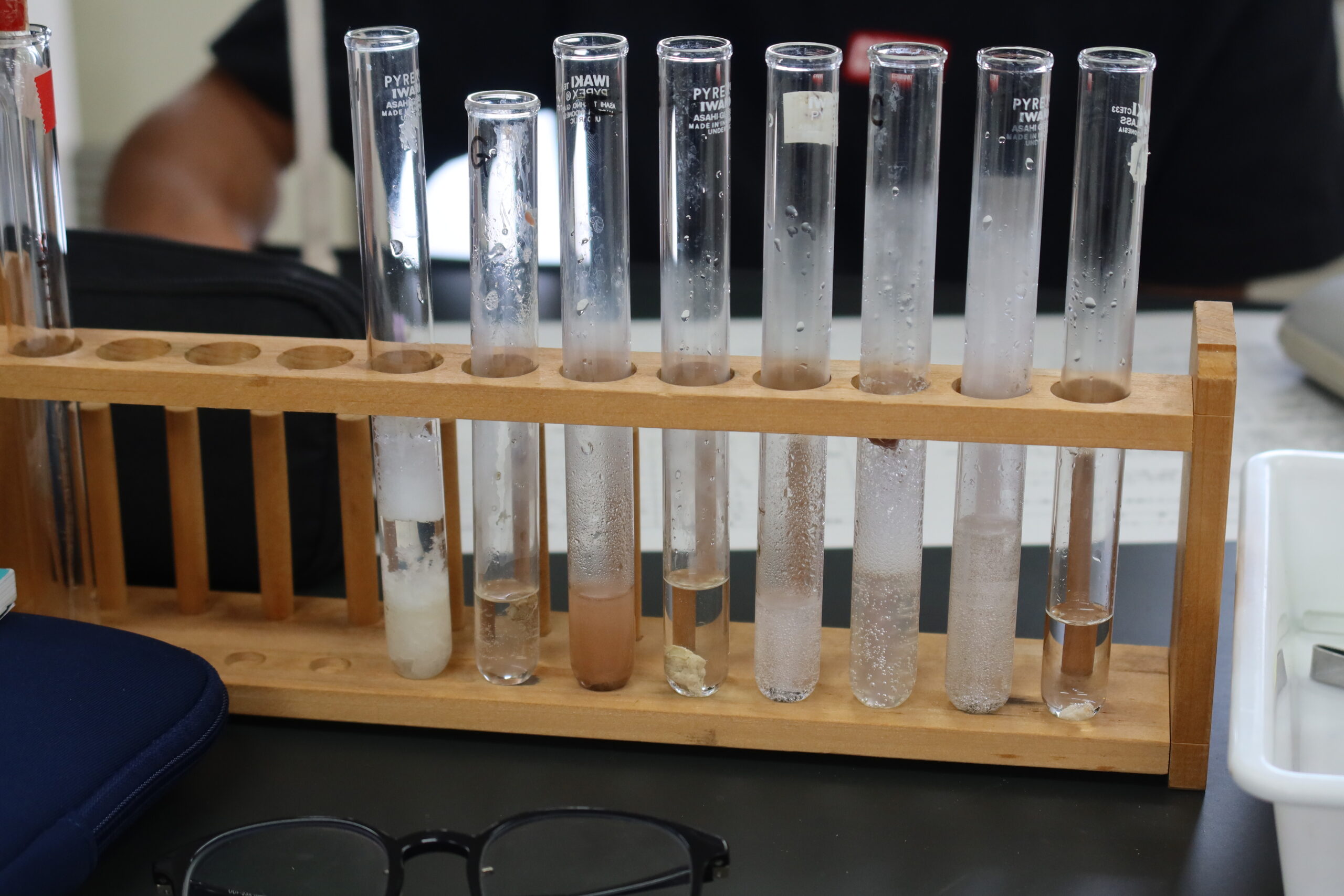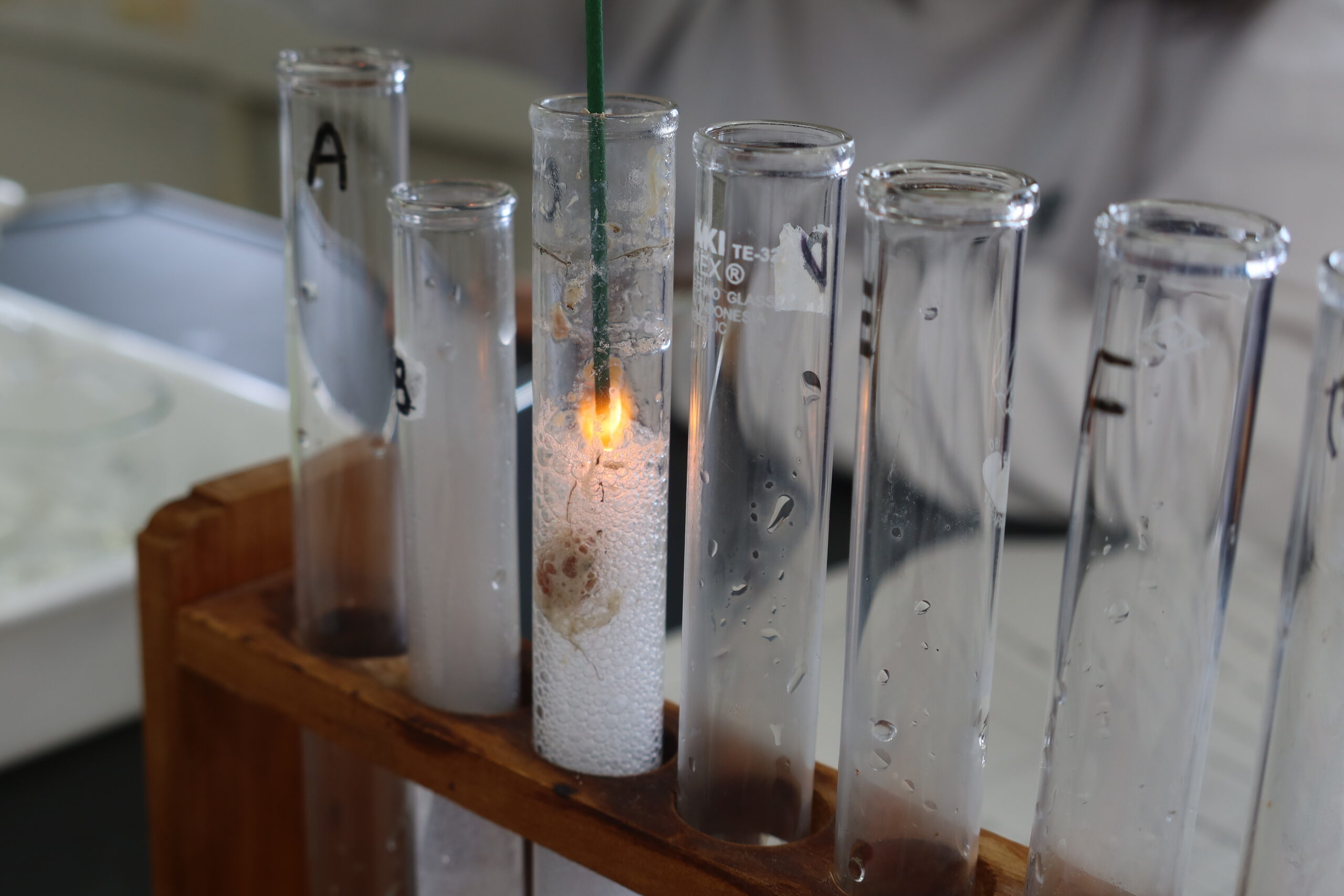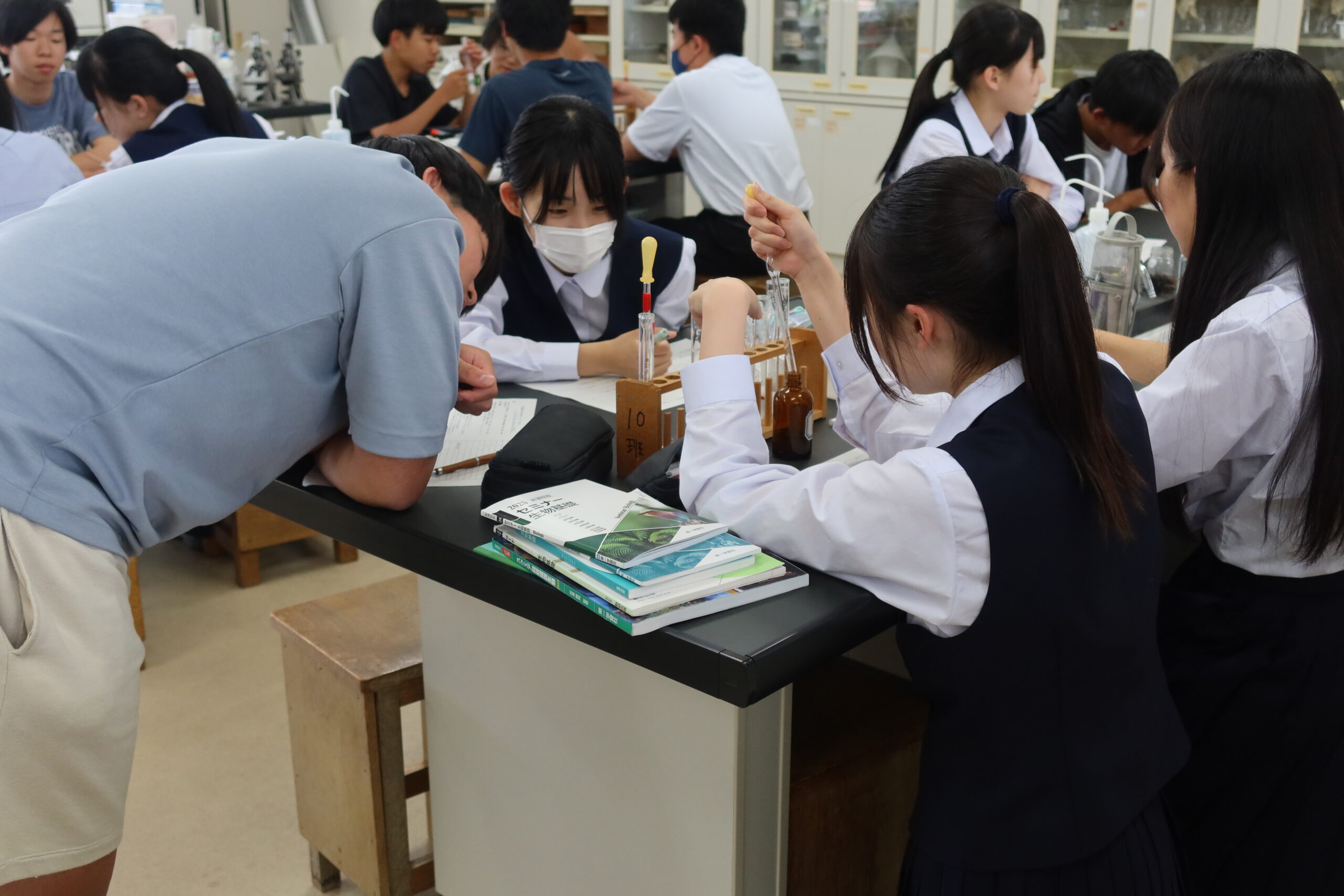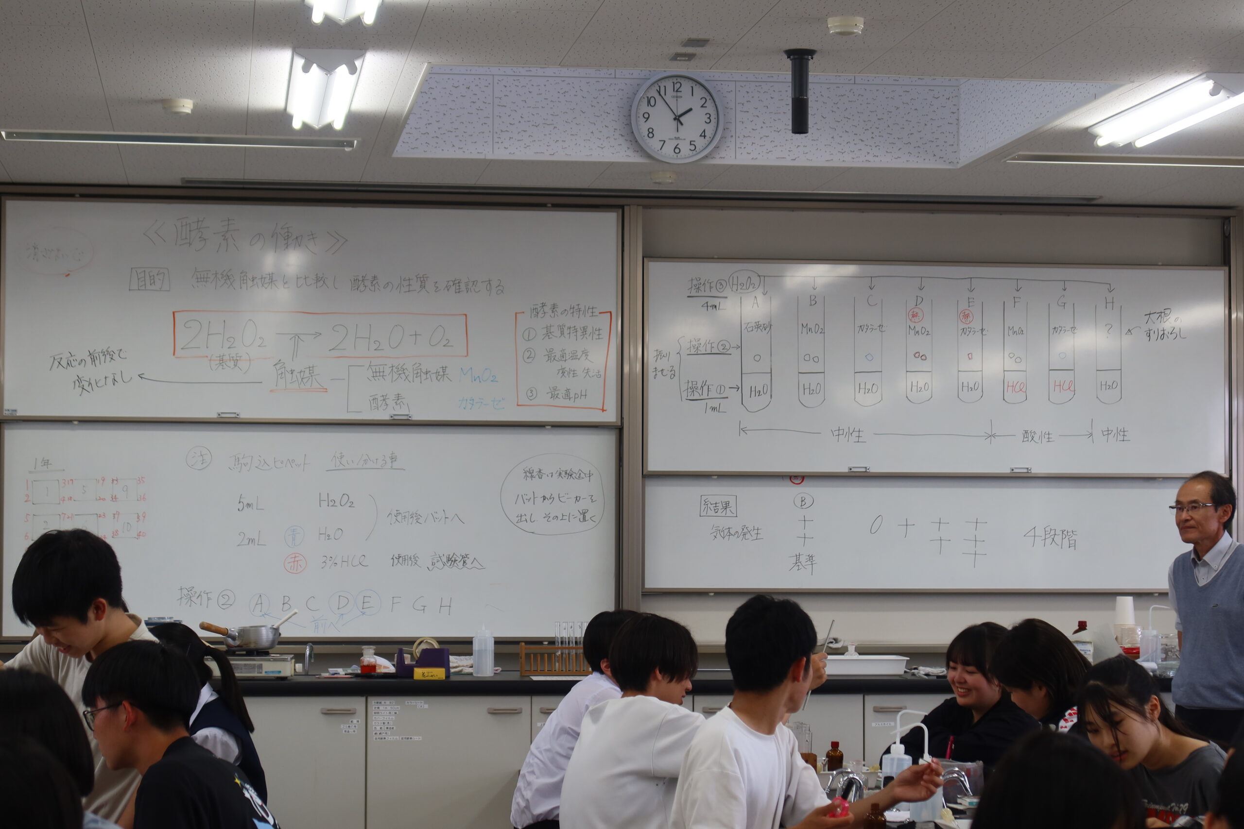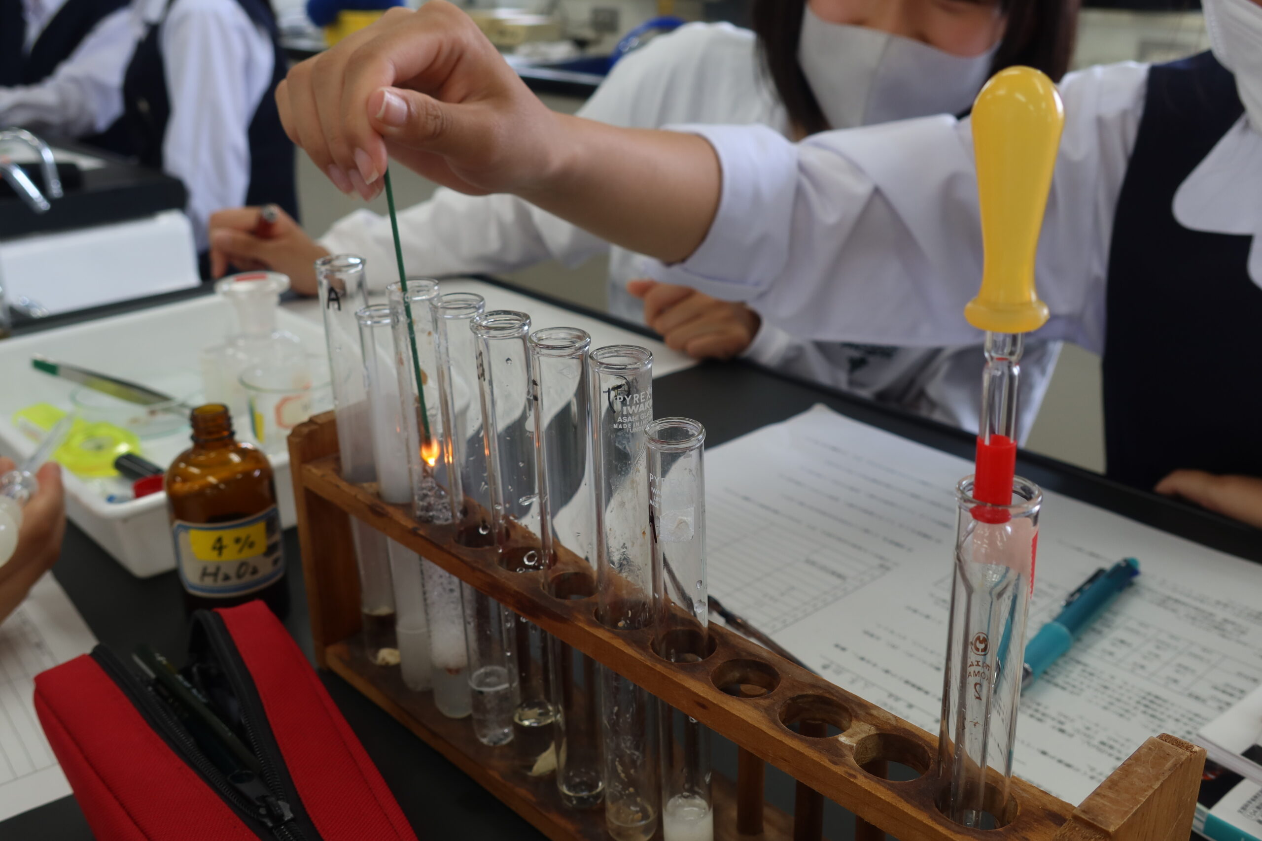 班によっては、試験管から泡が飛び出るくらいに反応が起こっているところもあり、生徒たちは楽しそうに実験していました。
