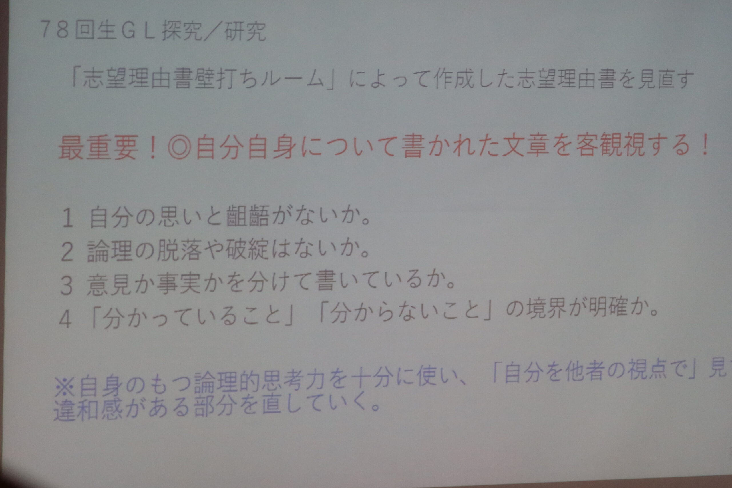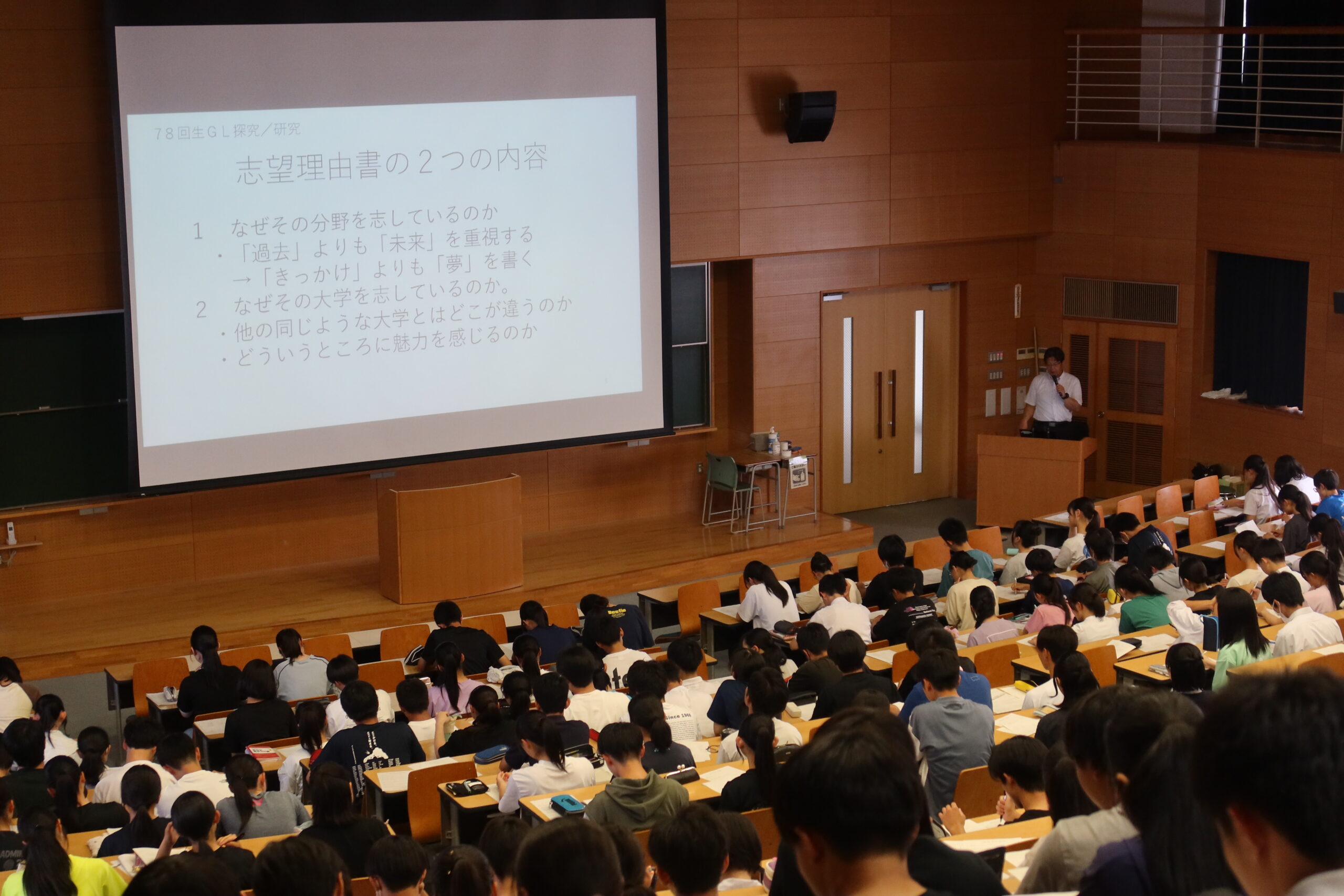 本日3年生を対象に大講義室で、探究活動に基づいた志望理由書を作成することについて講義が行われました。