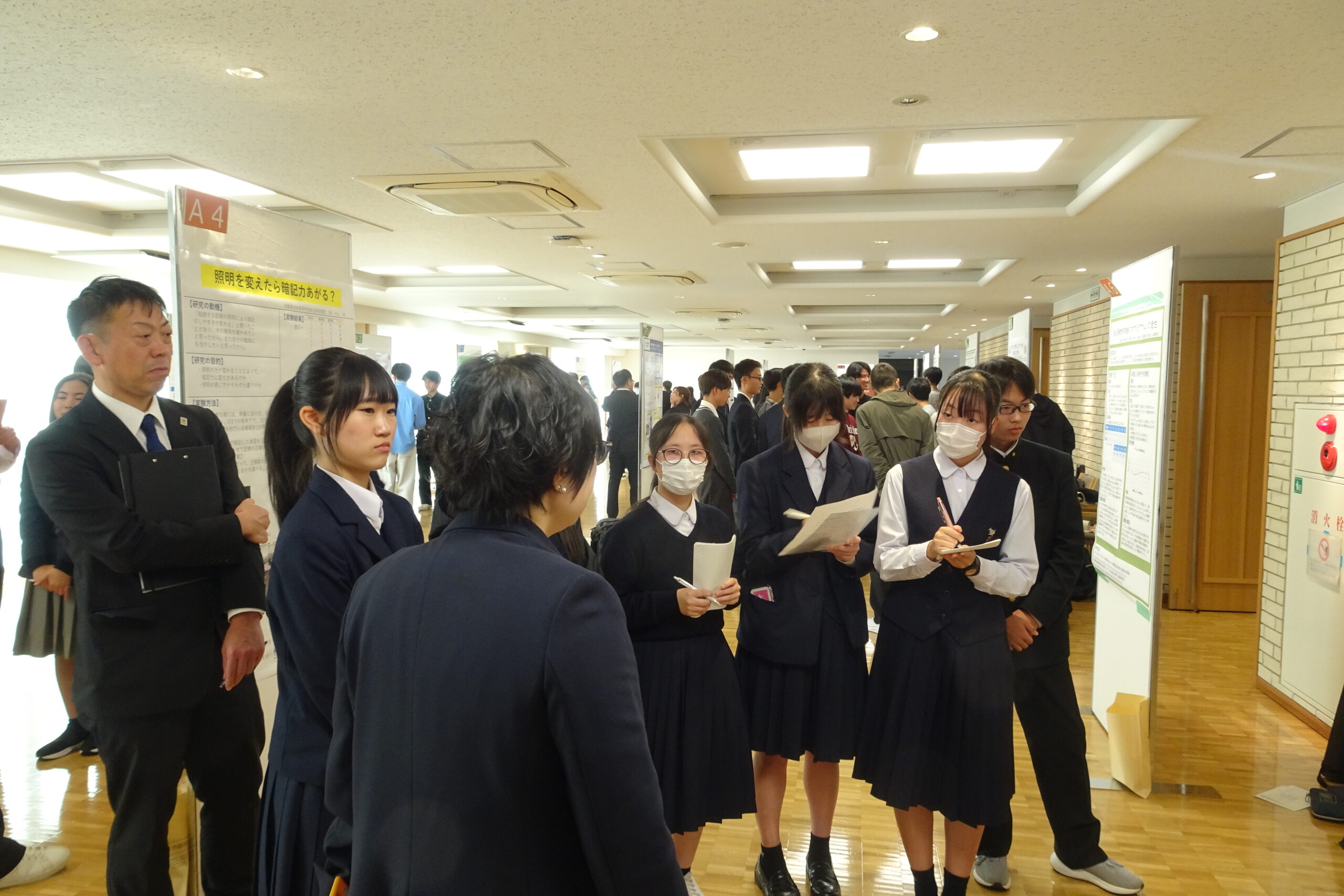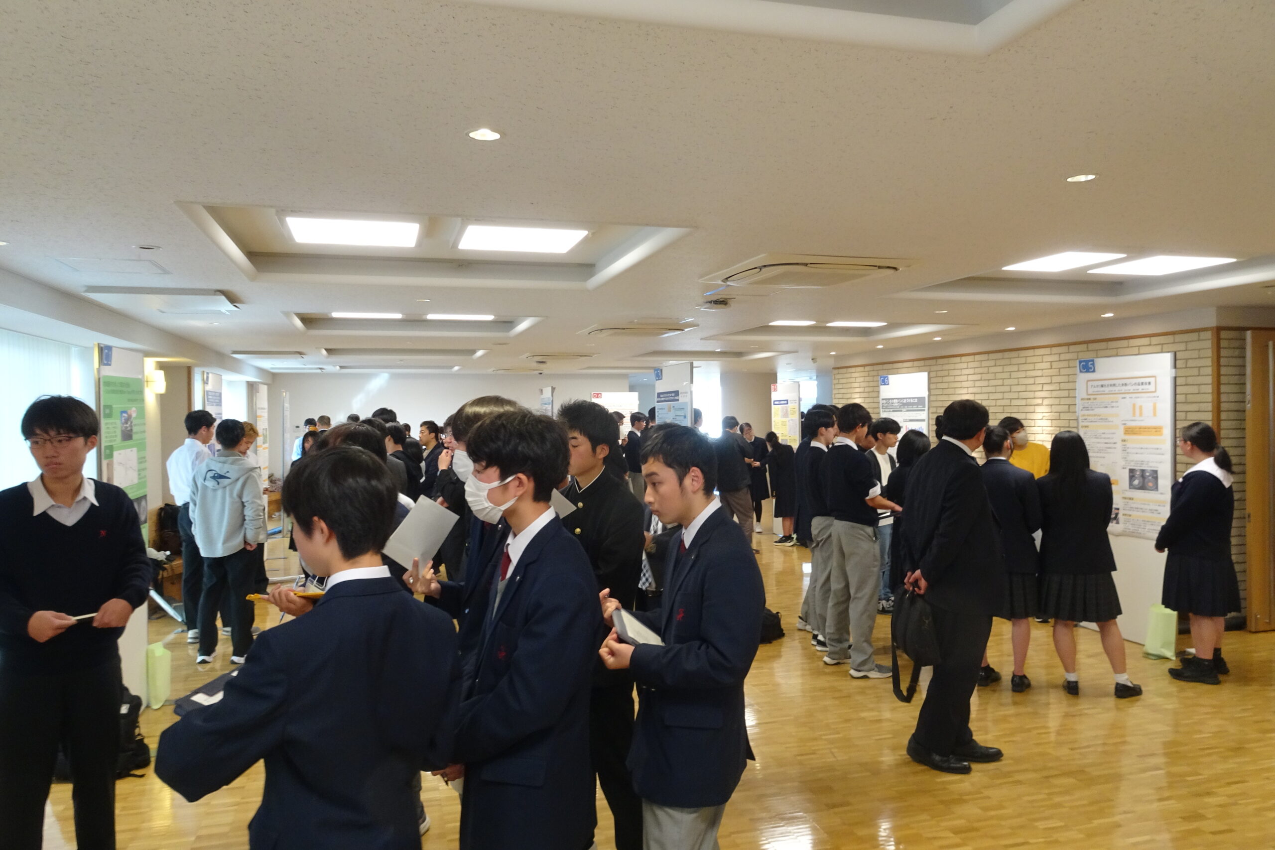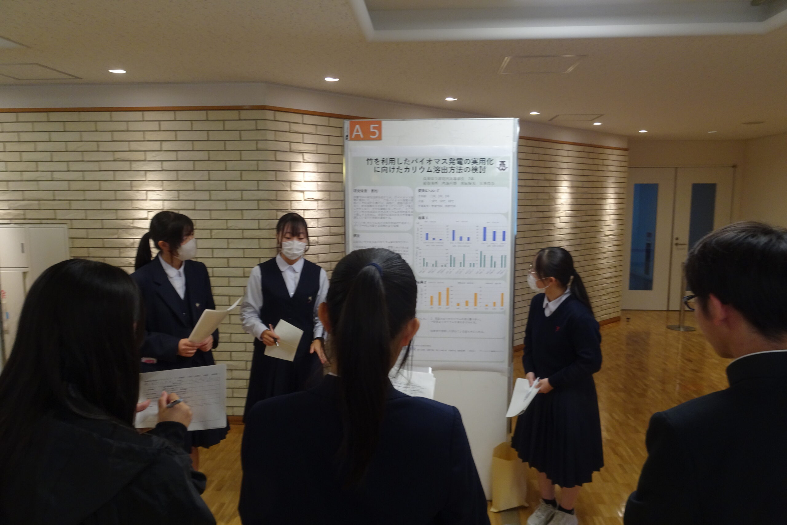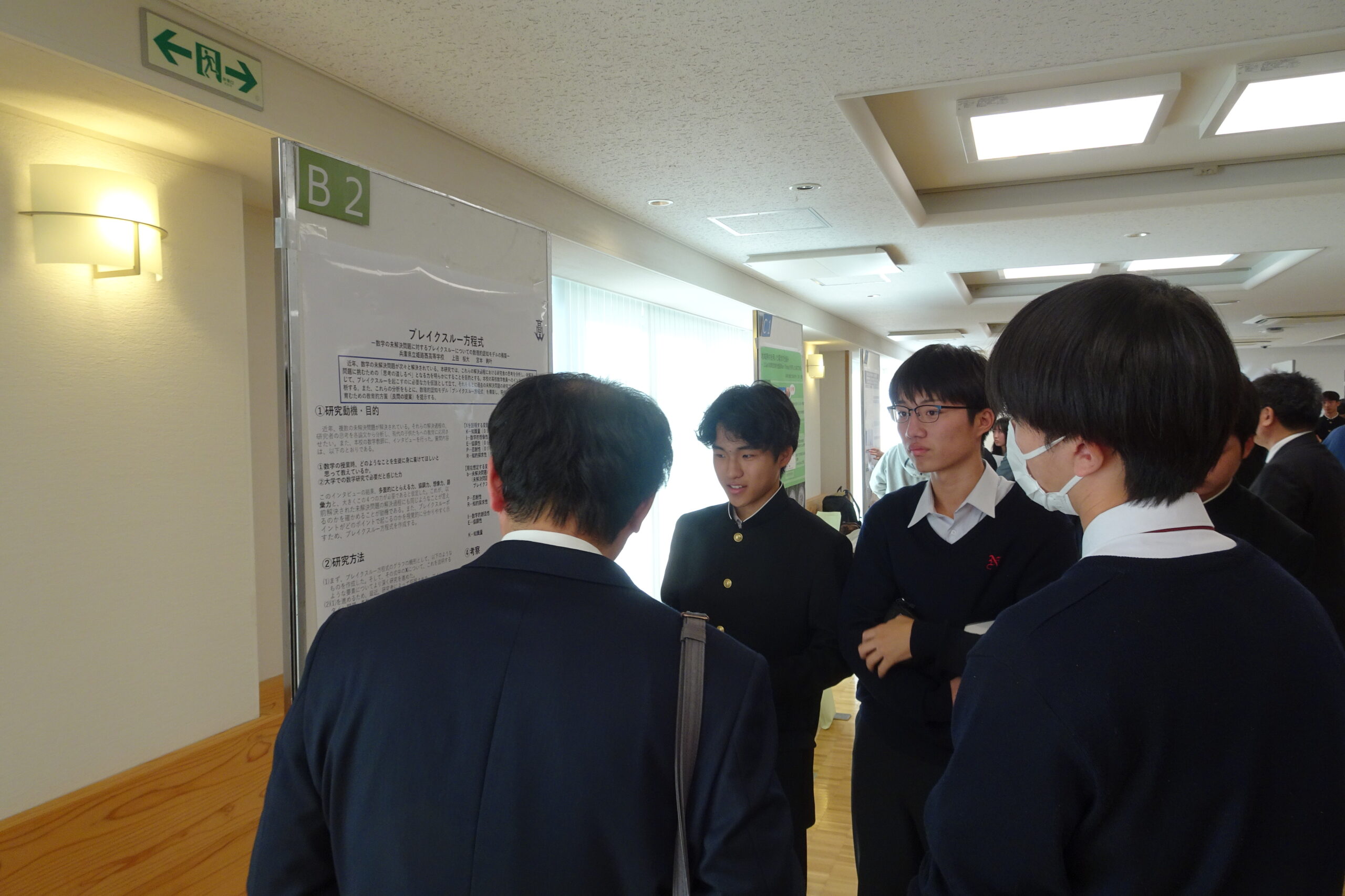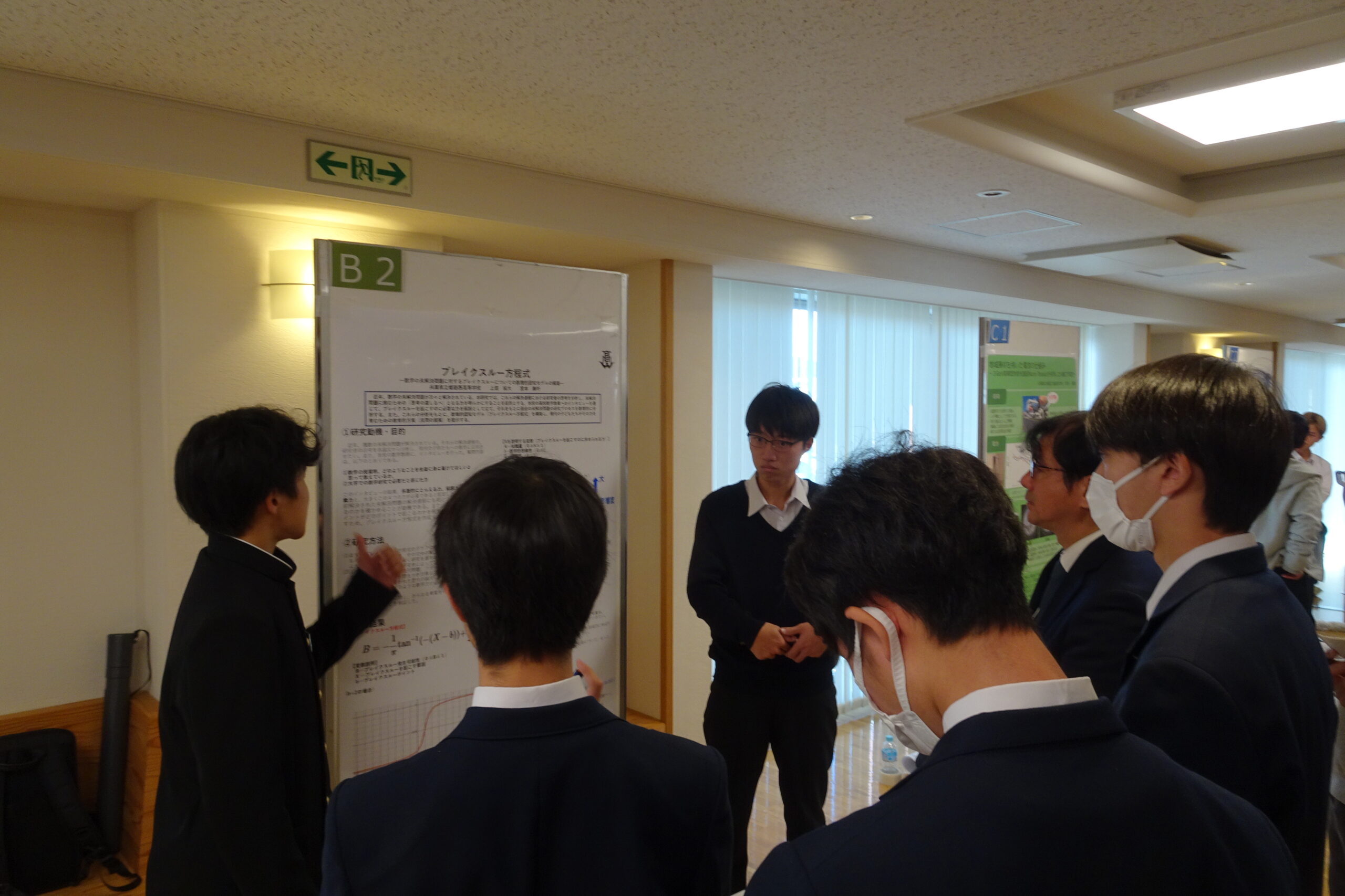 記念講演の後、数学研究グループは「数学における未解決問題の考察」、環境研究グループは「竹発電の実用化に向けて」という課題研究として取り組んでいる内容をポスター発表し、討議を行いました。大学の先生や大学生・大学院生からの指導や助言はもちろんのこと、参加した15校の生徒や教員から貴重な意見やアドバイスをいただくことができ、自身たちの研究を発展させるよい機会となりました。
