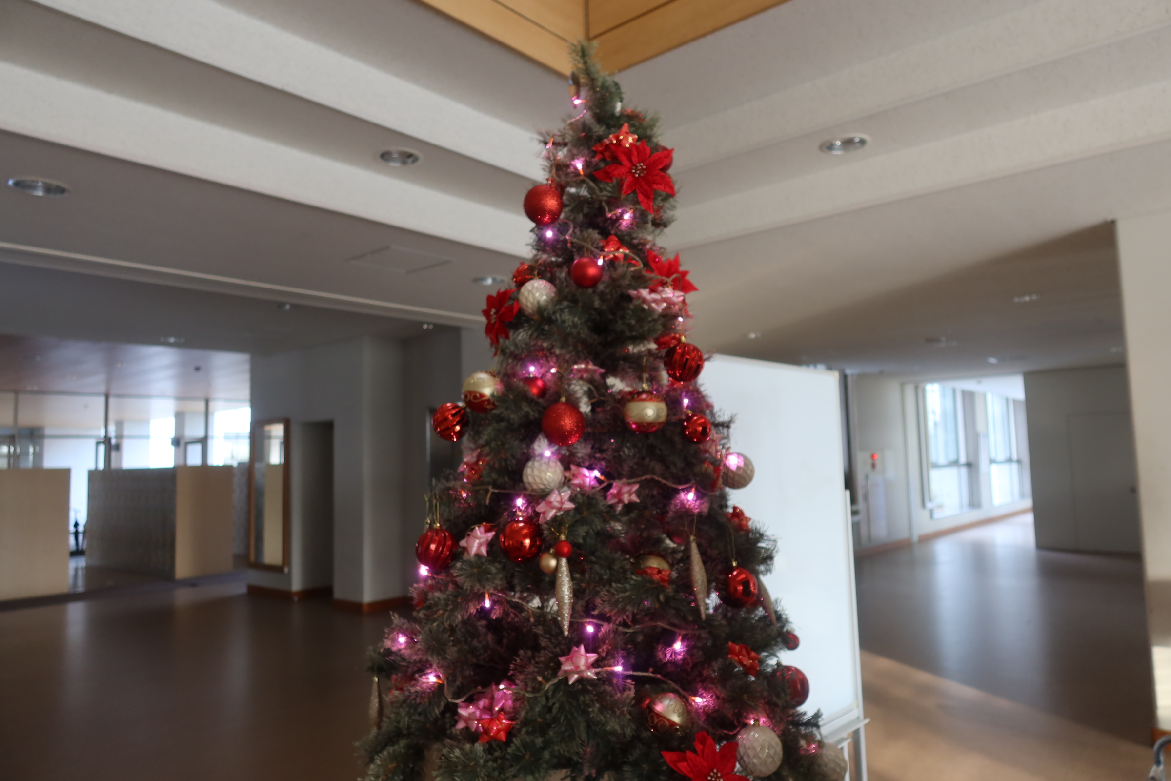 ただいま西高ではキラキラプロジェクトと称して、生徒玄関正面のコモンスペースにクリスマスツリーが飾られています。このプロジェクトは生徒会が主体となって行われていて、このクリスマスツリーのほかにも中庭の木々に電飾を取り付けたイルミネーションを計画しています。