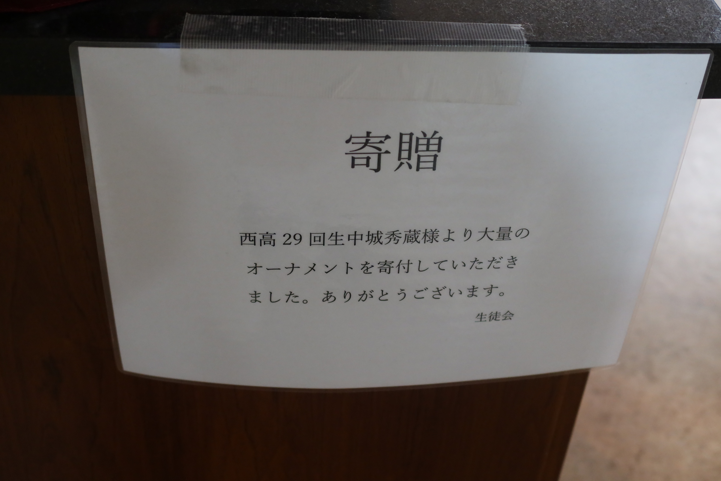 またオーナメントは、本校29回生の中城秀蔵様より寄付して頂きました。ありがとうございます。