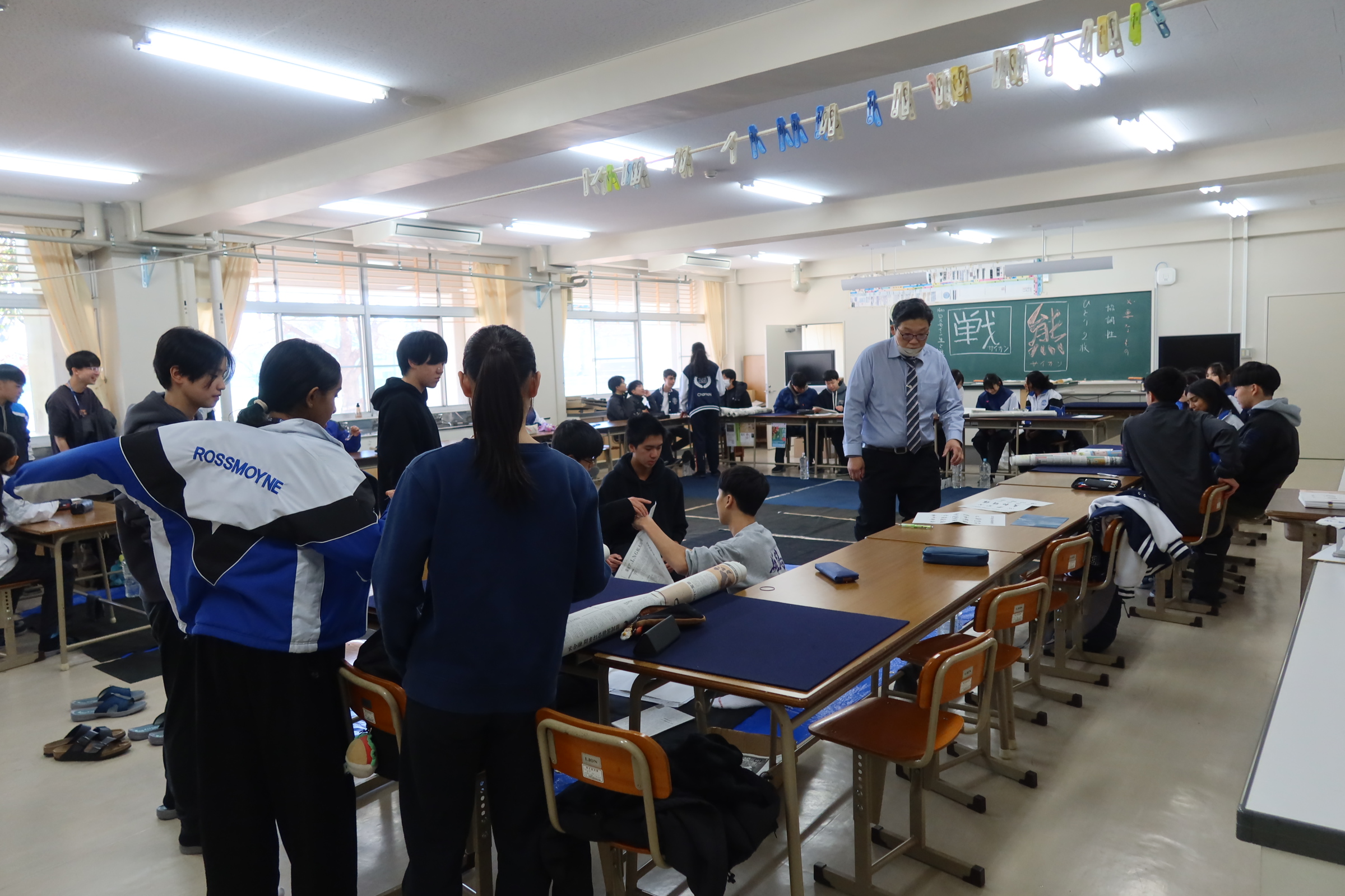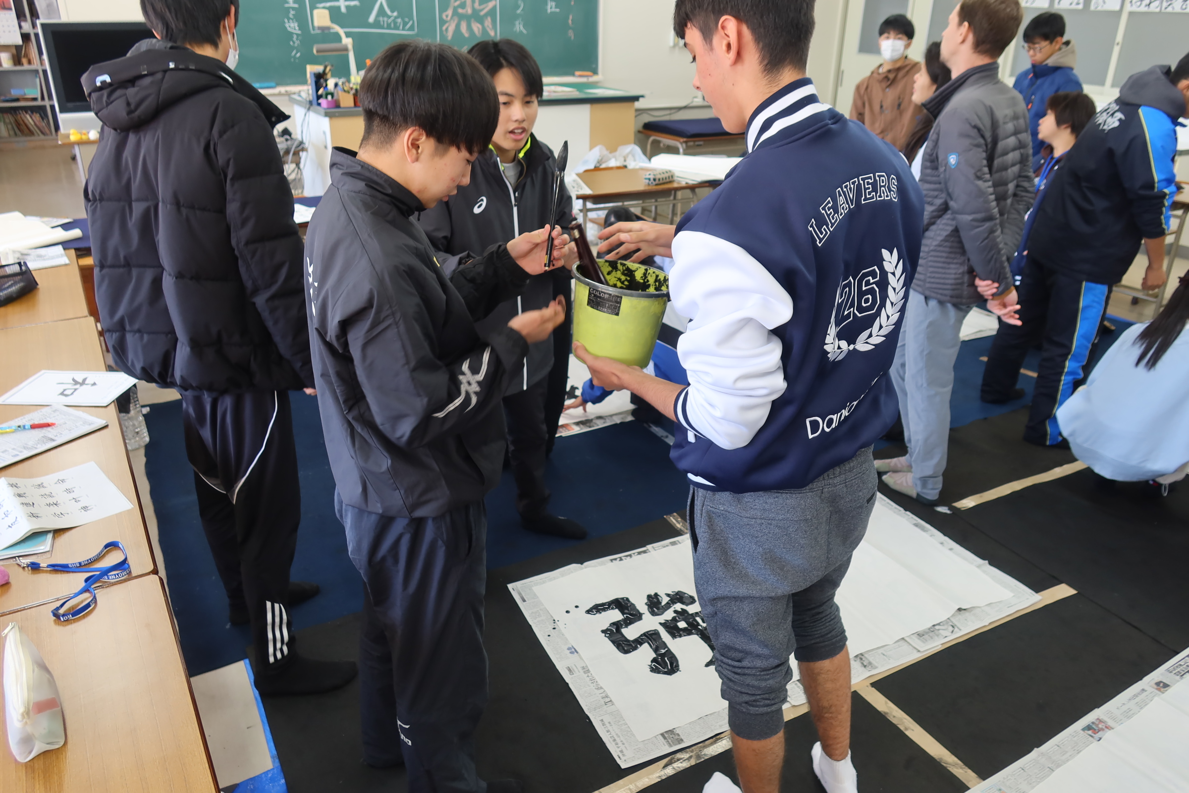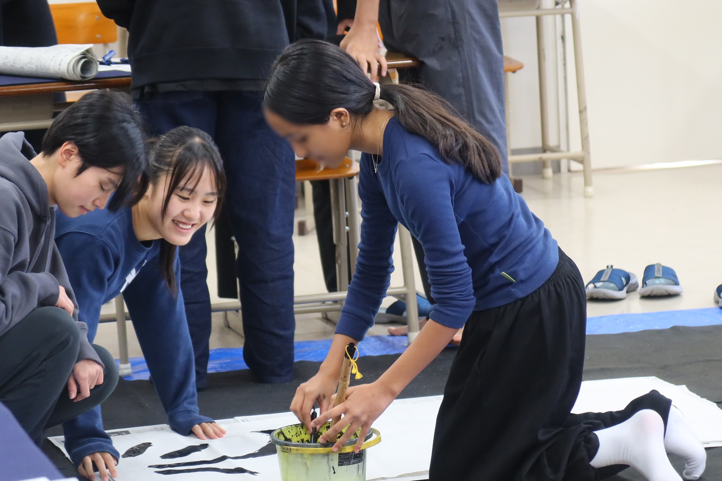 今日はロスモイン生が本校生徒と一緒に書道体験をしている様子です。