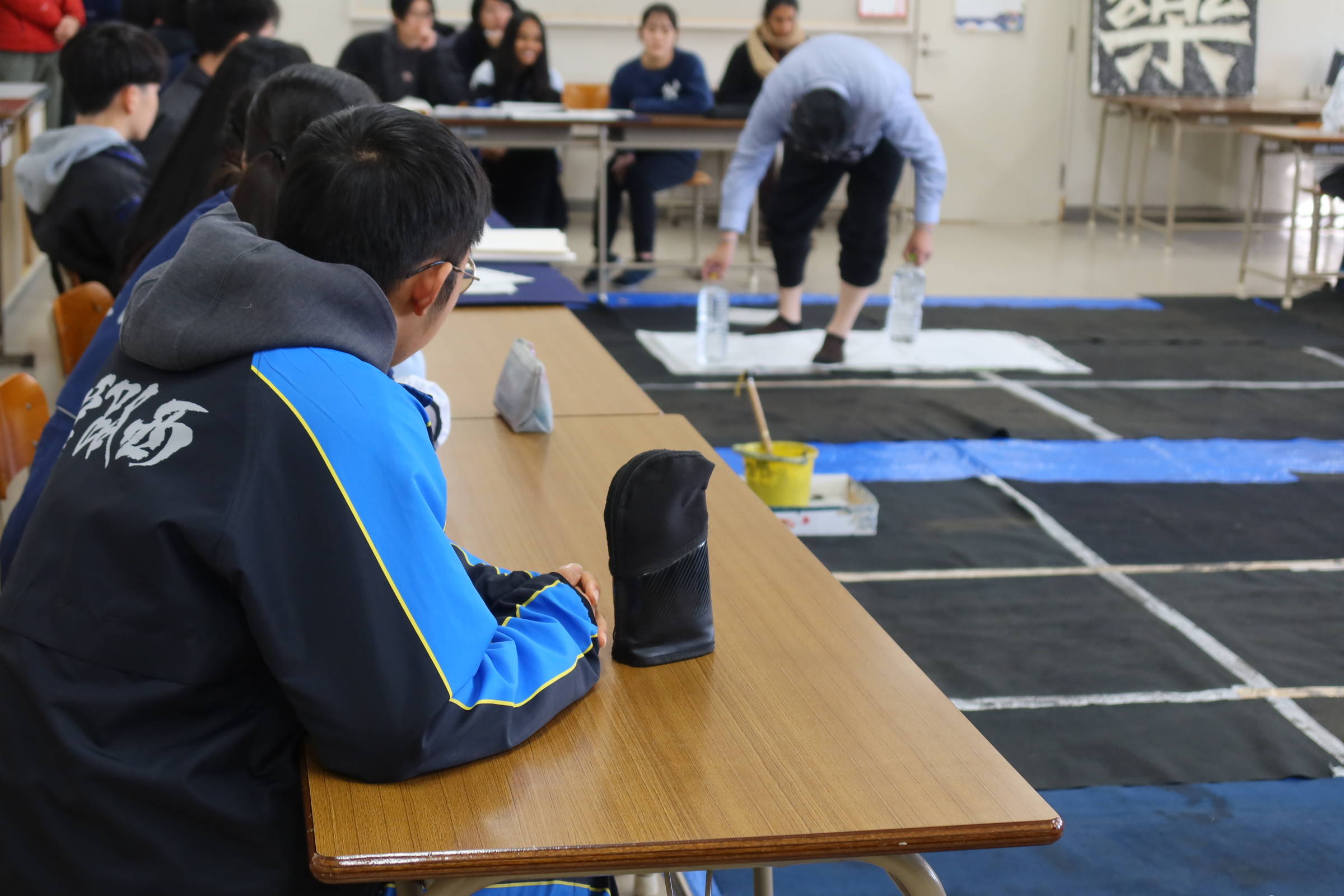 教員が授業の流れを説明すると、本校の生徒がロスモインの生徒へ英語で筆の持ち方や書く際の心構えなどを説明している様子が印象的でした。