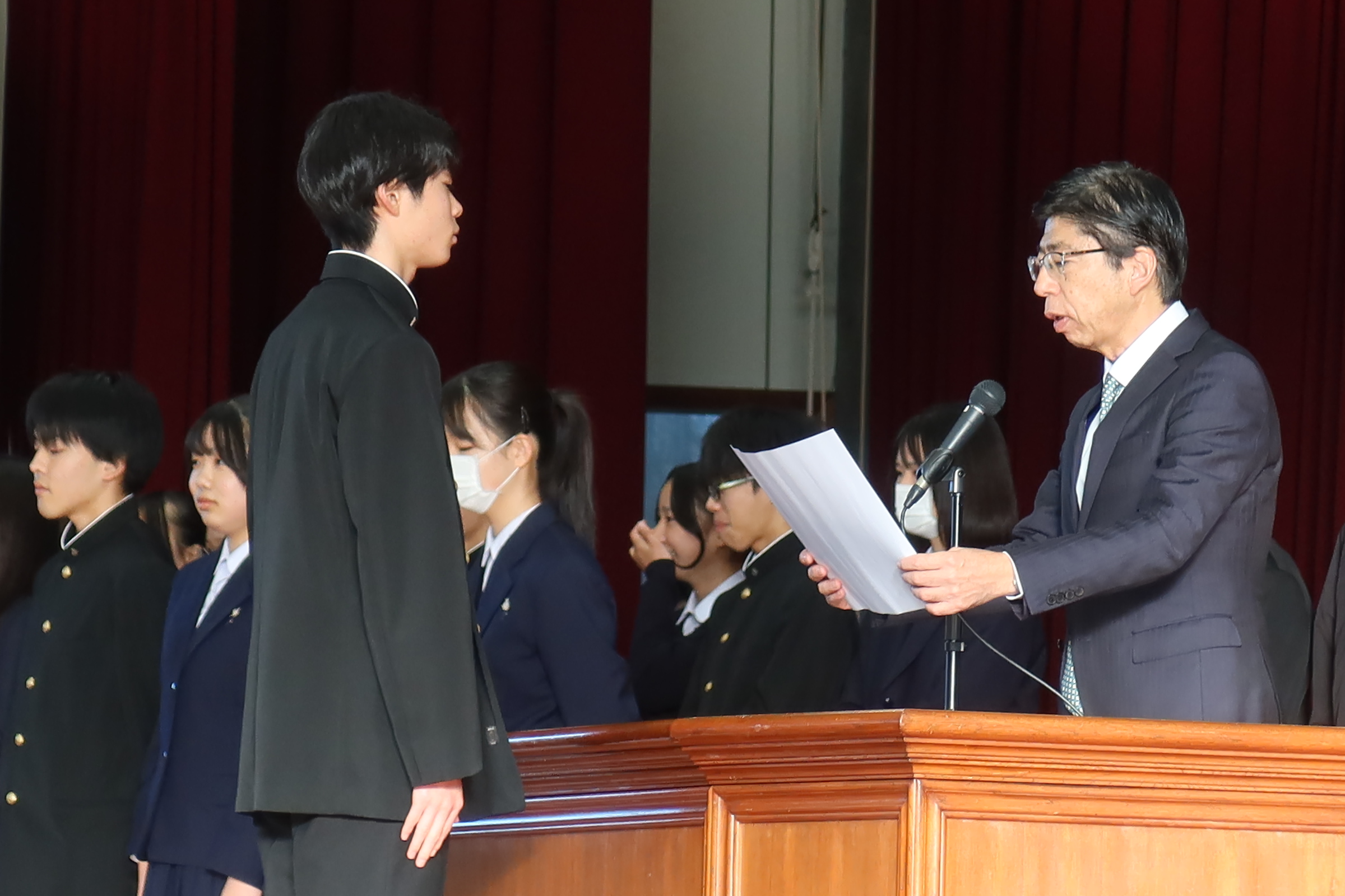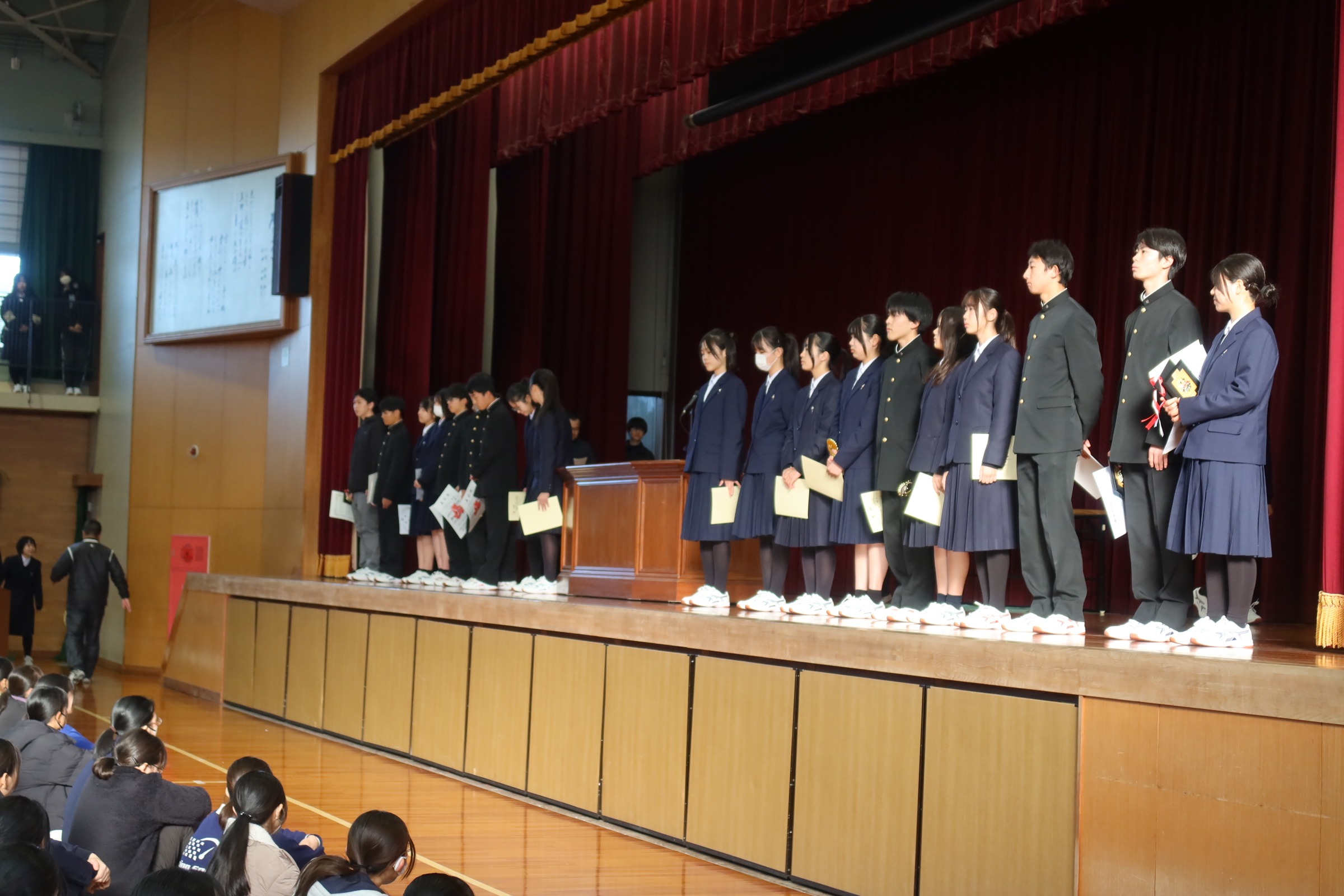 1時間目は体育館で全校集会、表彰式、壮行会を行いました。表彰式では優秀な成績を残した生徒を表彰し、その後の壮行会では応援団を筆頭に、次の大会へ進む生徒を全校生で送り出しました。