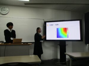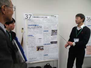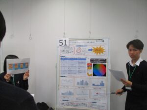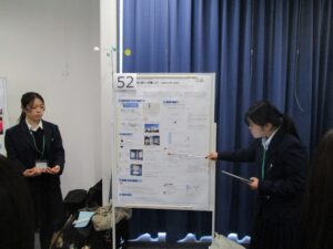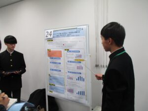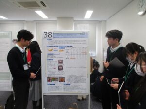 2年生は、1年間の探究活動の成果をポスターやスライドにまとめ、高校生や教員、専門家の先生方に分かりやすく発表し、質疑応答を行いました。また、自身の発表の合間には、時間の許す限り、興味のある他校生の発表を見学しました。一部の生徒は進行係を担当し、発表会の円滑な運営に尽力しました。今回は、大学や企業、研究機関等の発表や講演などもあり、自然科学を通して、世代を超えた交流ができました。