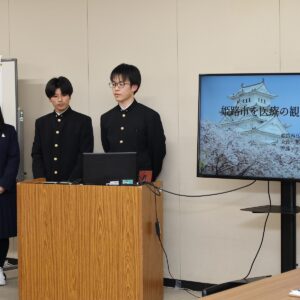 姫路市長をはじめとした市政に携わられている方々に、これまでの探究活動で地域の課題について取り組んできた内容を聞いていただく機会をいただきました。出席者の方々からは、高校生の視点からの分析や提案を興味深く聞いてくださった後、各部署で取り組んでおられる内容の現状を聞かせていただいたり、高校生へ質問をいただいたりしました。また、市立姫路高校の生徒さんの発表を聞くことで新たな視点を得ることができ、今回の企画で多くのことを学ばせていただきました。貴重な機会をいただき、ありがとうございました。