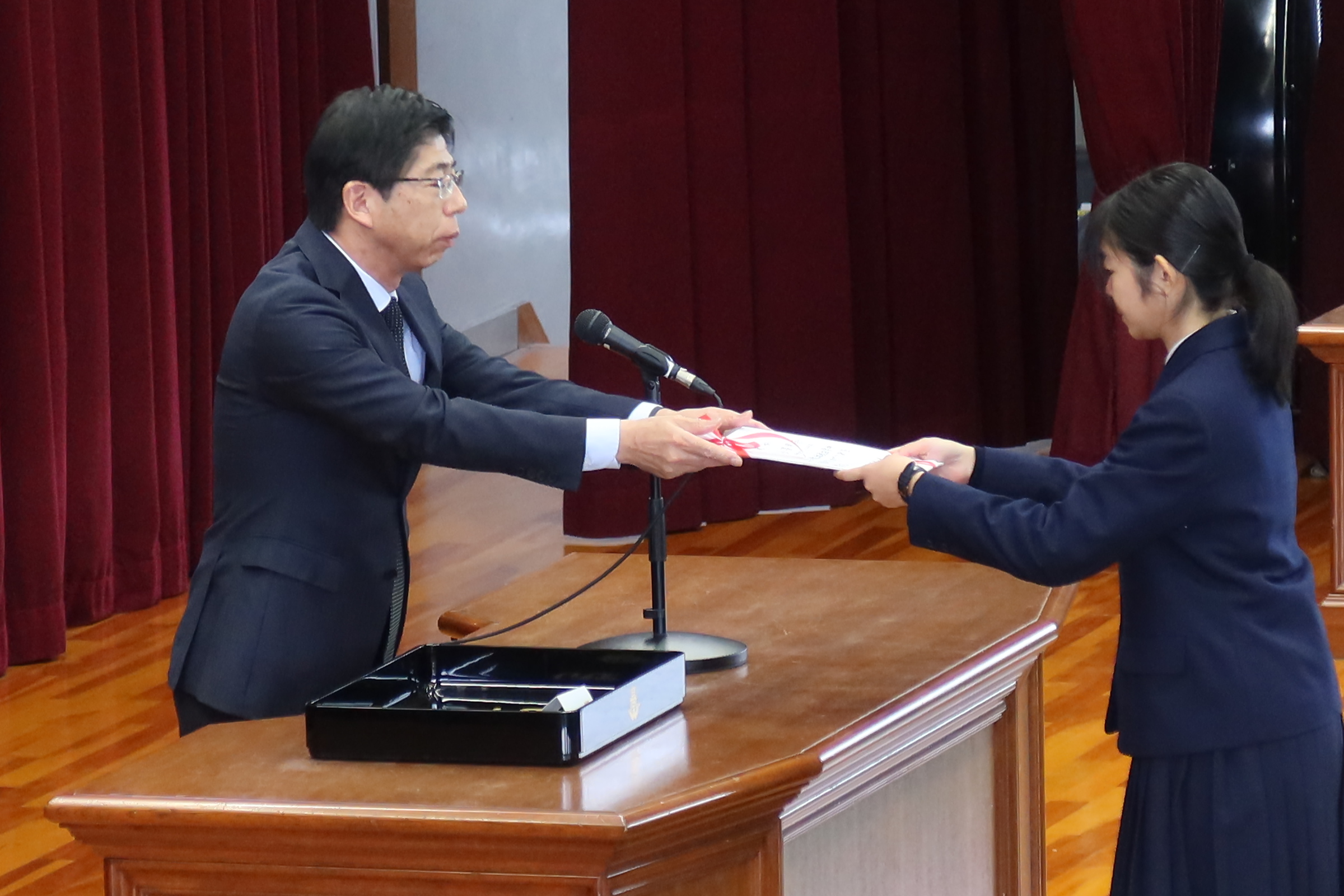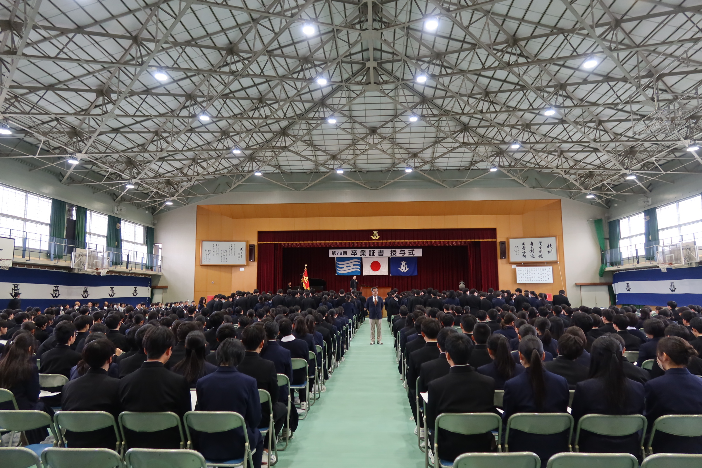 本日全校生で明日行われる卒業式の予行、皆勤賞授与式、記念品贈呈式を行いました。