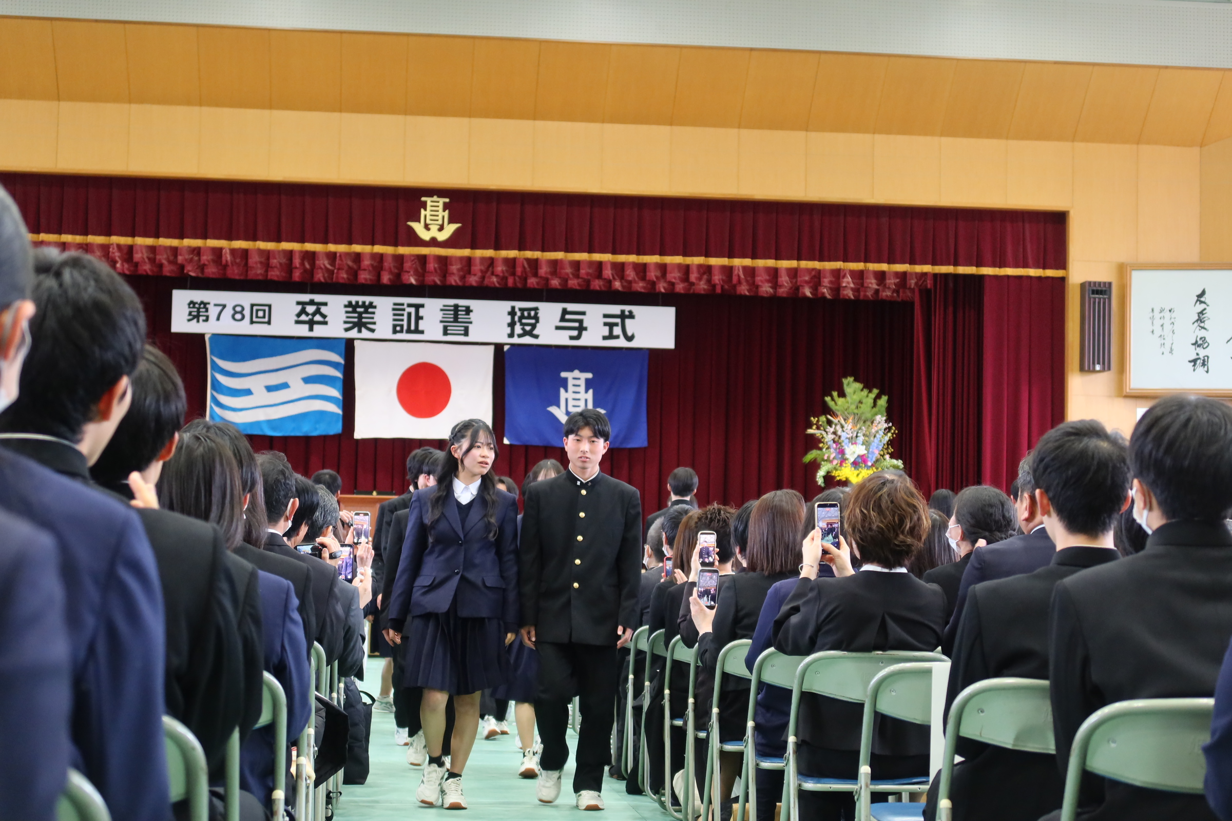 式は室内合奏部、ギターマンドリン部、吹奏楽部の演奏に合わせて進行し、在校生や保護者の皆様に見送られながら卒業証書授与式を終了しました。
