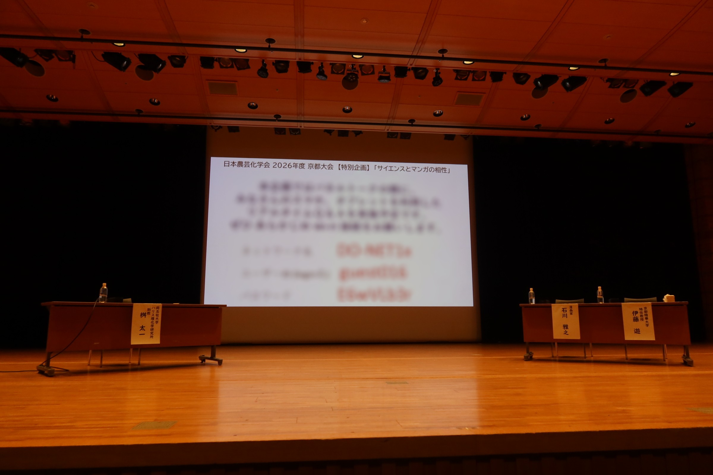 また、表彰式、閉会式後の「サイエンスとマンガの相性」についてのパネルディスカッションにも参加しました。スマホを用いてリアルタイムで質問を入れる聴衆参加型のイベントで、マンガを通したサイエンスコミュニケーションについて2時間程度行われました。