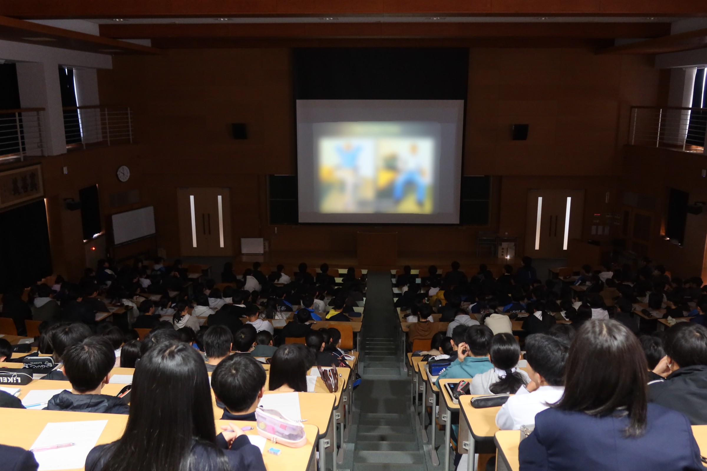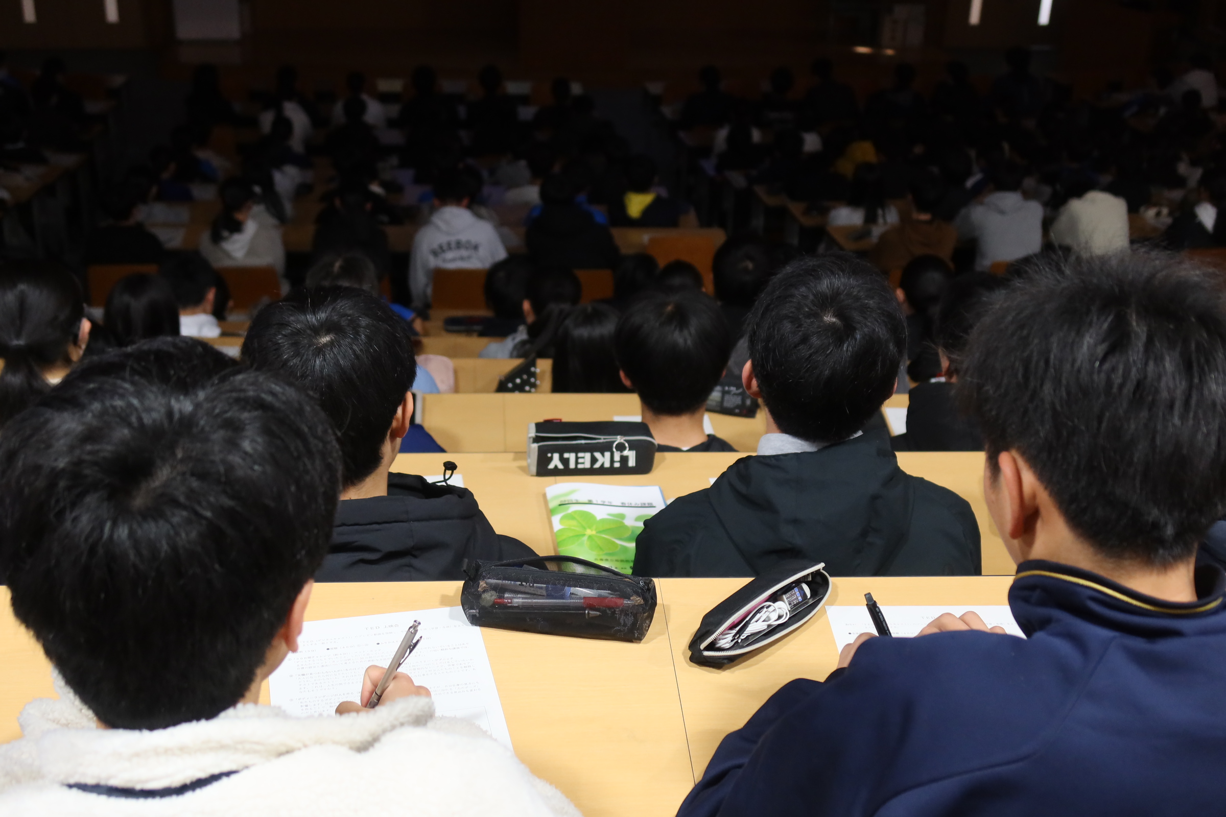 体育館に80回生が集まり、3本の動画を視聴した後振り返りシートを記入しました。