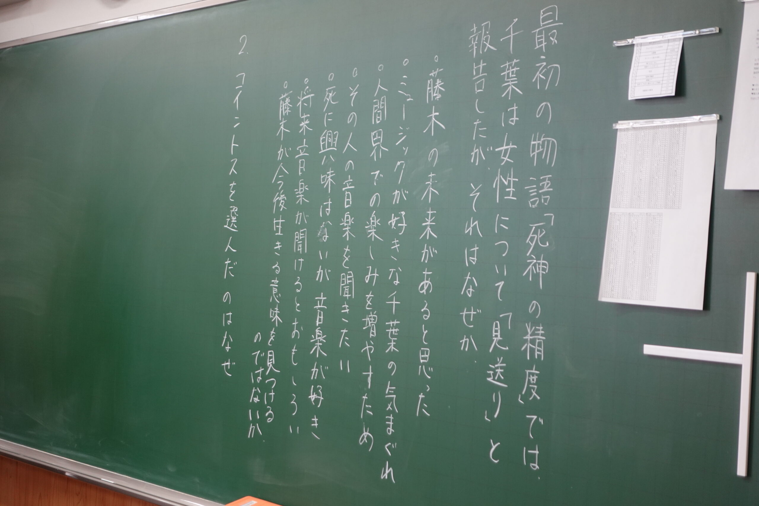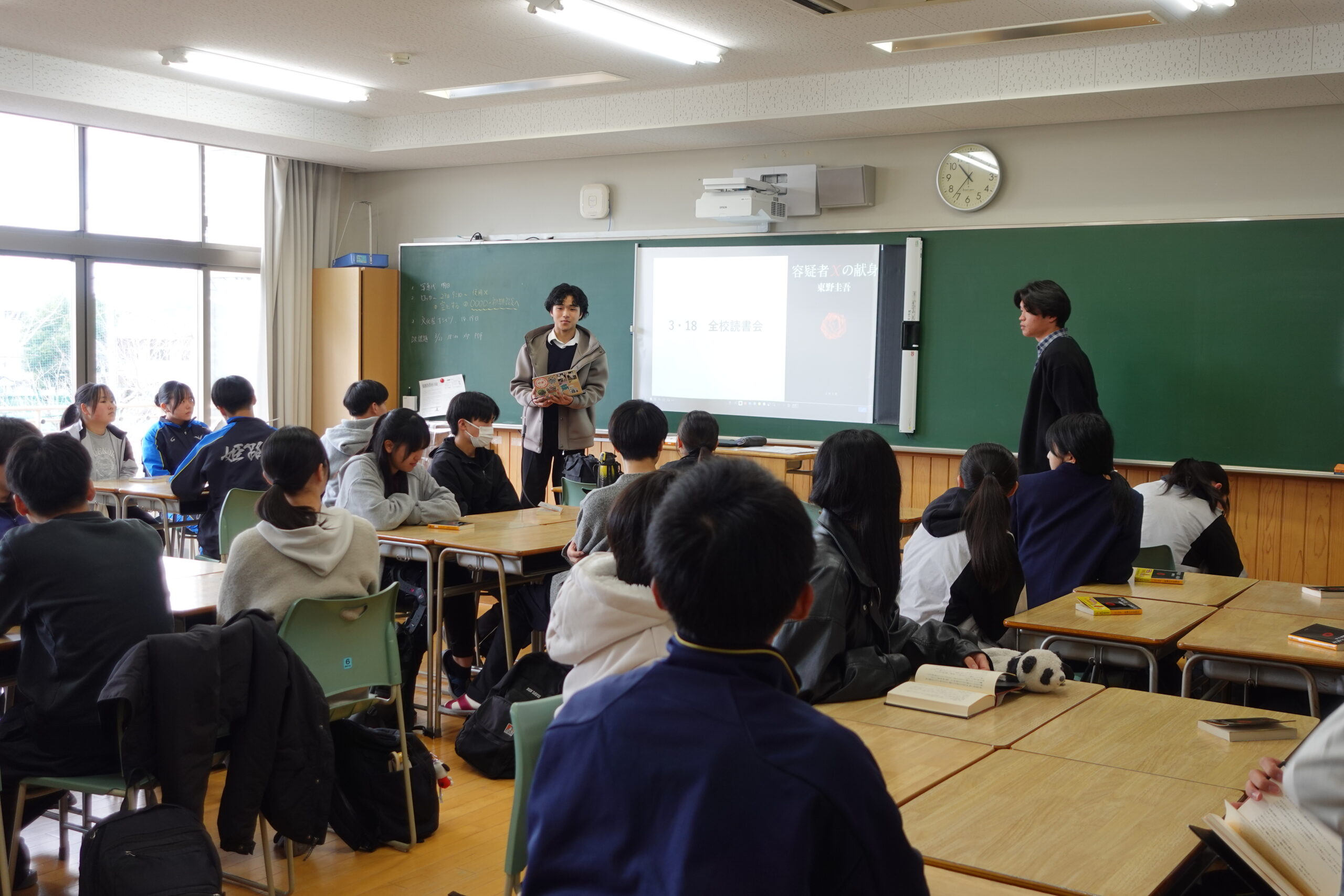 「アルジャーノンに花束を」や「オリエント急行の殺人」など11冊の中から自分が読みたい本を選び、各教室に分かれて議題に沿って話し合いを行いました。