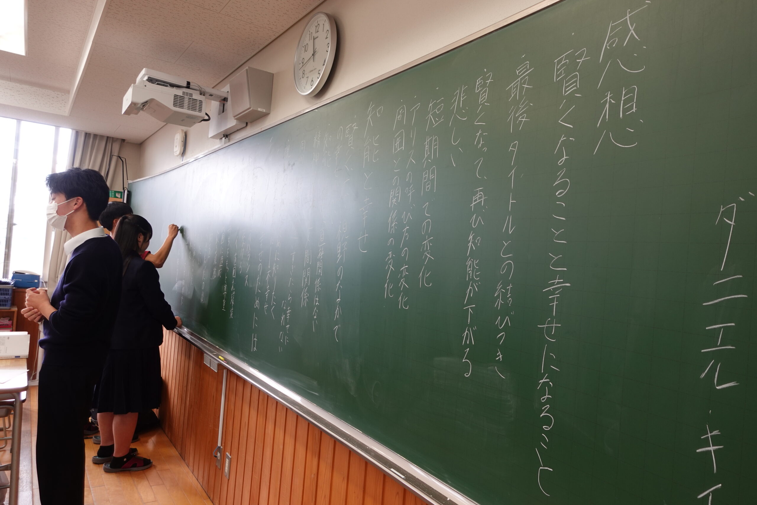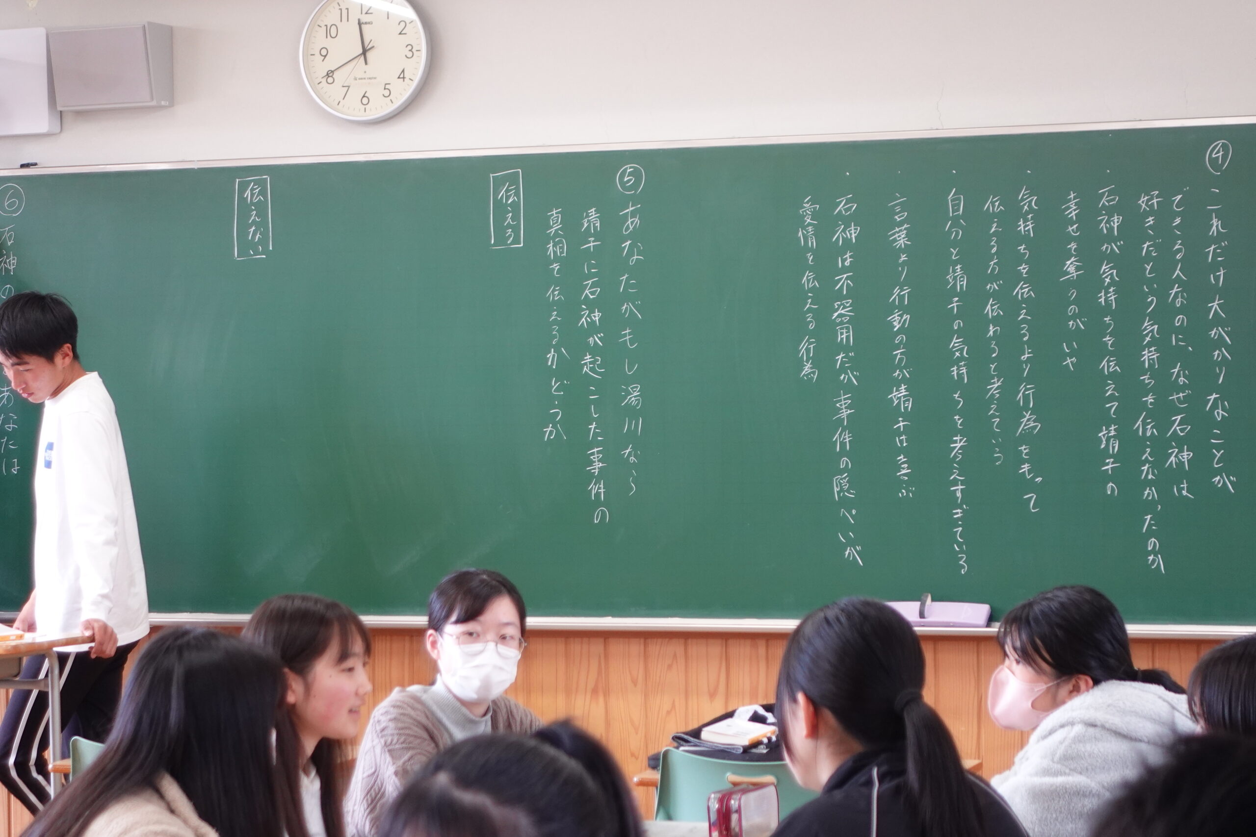 司会進行、板書などをすべて生徒主体で回し、登場人物やシーン、出来事についてどう感じたか、自分ならどうするかなどを班で話し合い議論を深めていきました。