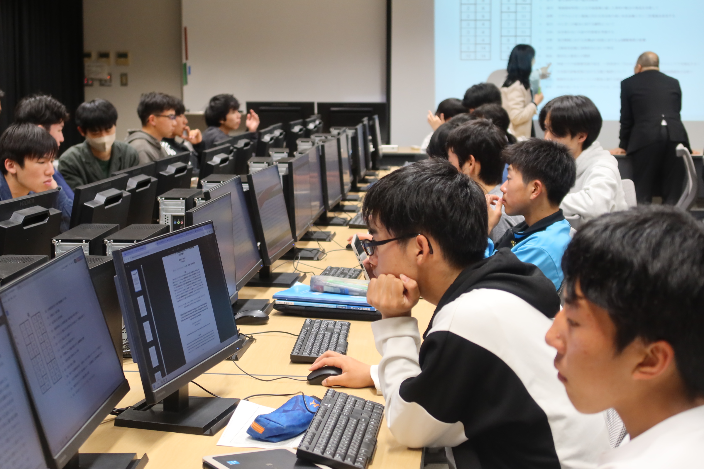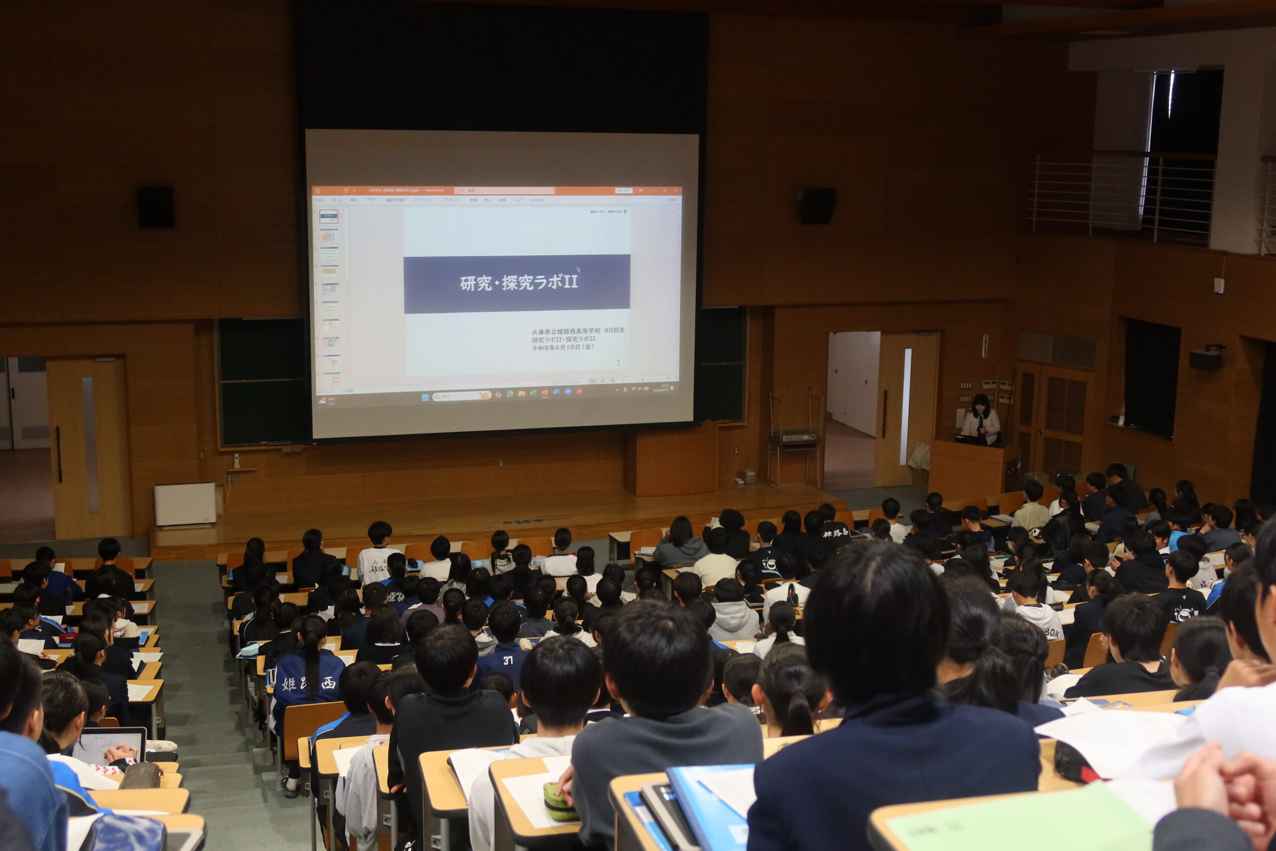 5時間目に2年生全生徒が大講義室に集まり、これから探究活動をスタートするにあたって、1年生での「型を学ぶ」のふりかえり、今年度の年間計画の確認、課題研究の意義などについて講義を受けました。研究・探究ラボⅡでは1年生時に学んだ「型」をもとに、「型を磨く」探究活動を進めていきます。