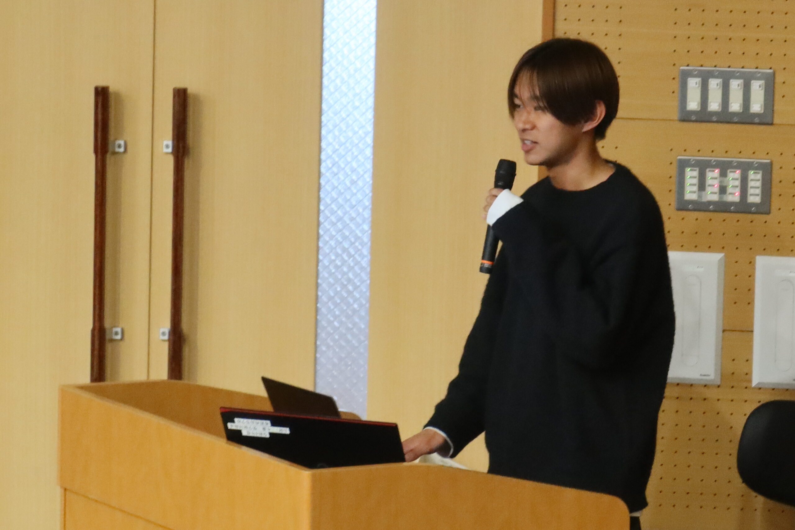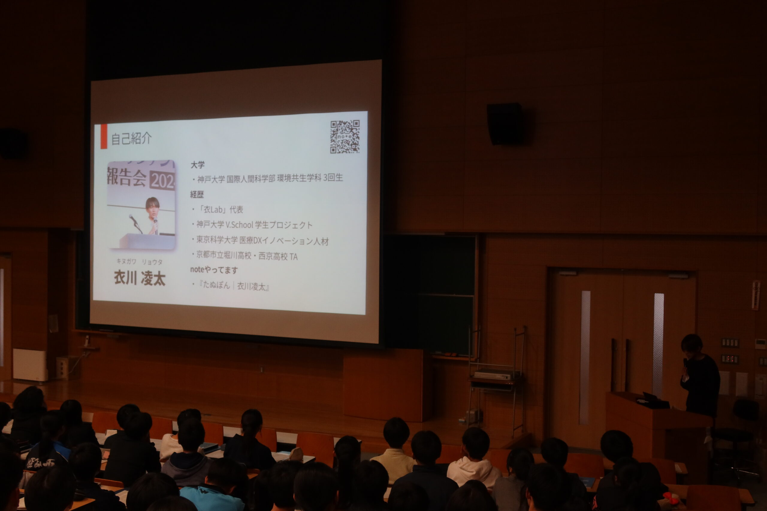 その後、本校の卒業生であり神戸大学 国際人間学部3年生の衣川 凌太さんが来校し、生徒たちに向けて話をしてもらいました。衣川さんはこれから9月初めまでTAとして、主に社会科学系の探究を行う生徒たちに課題研究のアドバイスをしてもらう予定です。