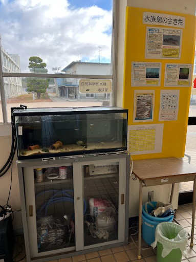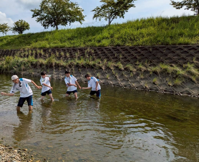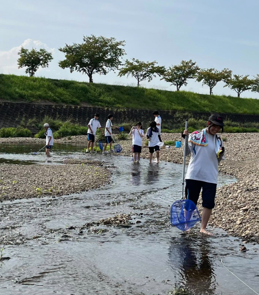 万願寺川で春と夏に水生生物の調査をしました。ハゼ、モロコ、オイカワ、タナゴ、ゴクラクハゼ、ヨシノボリ、ヌマエビ、テナガエビなどを採集しました。生き物は学校の生徒玄関の水槽で飼育しています。