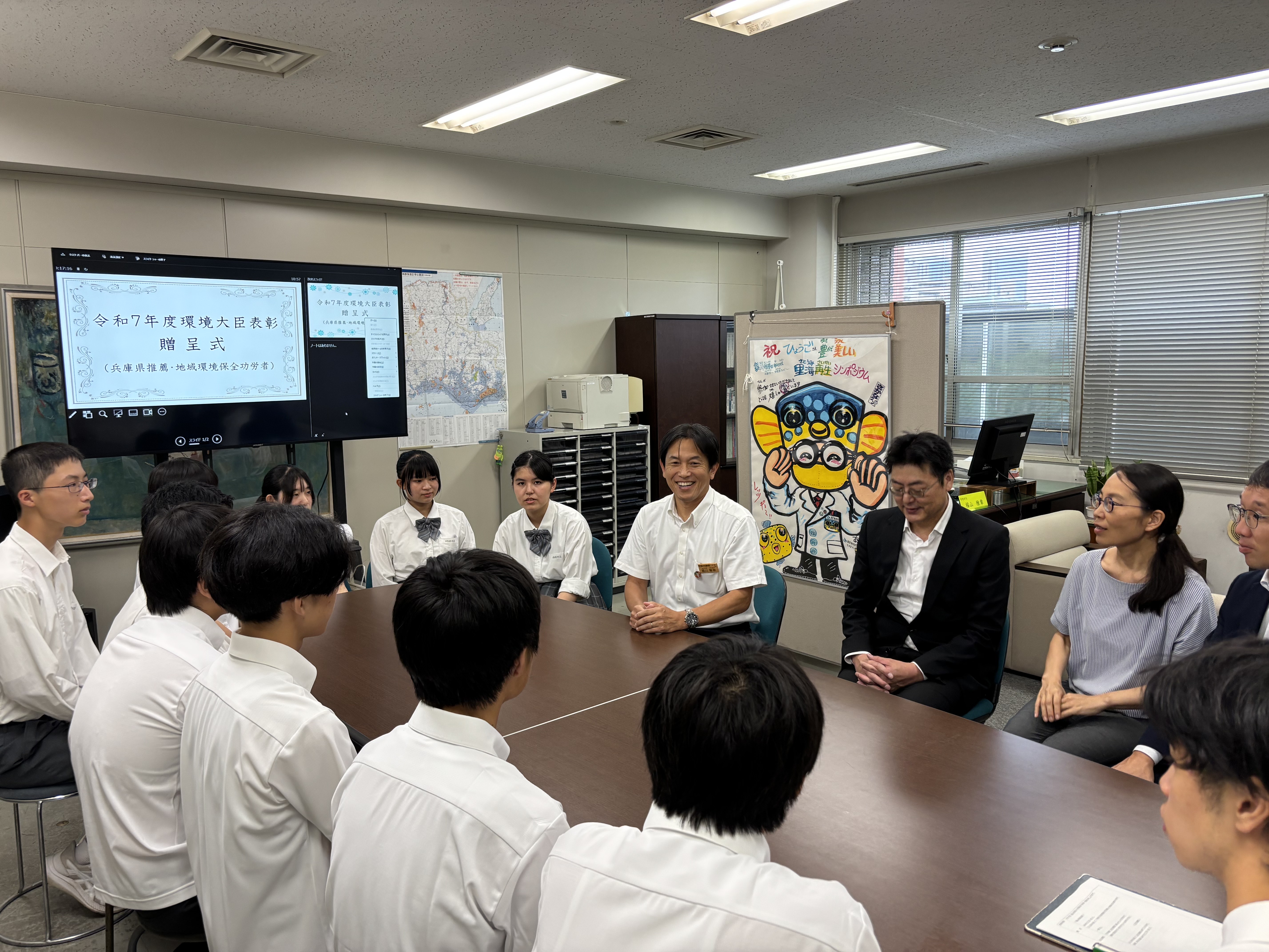 令和7年度環境保全功労者環境大臣表彰を受賞し、兵庫県庁での表彰贈呈式に部員全員で出席しました。あびき湿原保存会と共に行ってきた10年間に渡る湿原保全活動と、近年力を入れてきた同湿原の生物調査・広報活動が認められた結果です。後日、神戸新聞と広報かさいから取材を受けました。広報かさいには2026年1月号に掲載されます。