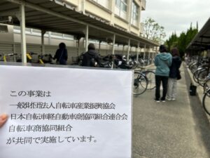 三田市自転車商業組合から6名来ていただき、組合方の指示のもと、育友会生徒指導部が主体となり国際理解推進部、学年部、本部も参加して6班に分かれて512台の自転車を点検しました。