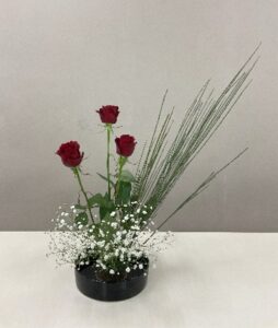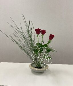 今年度最初のお花のお稽古でした。緑鮮やかなエニシダを片側に流し、春うららかな白いカスミソウを足元に入れ、中心に赤いバラを配しました。