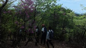 比較的登りやすい山で楽しかったです。森の小道みたいな道で川も流れていて、川の周辺は涼しかったですが、それ以外は蒸し暑い感じでした。低い山でしたが、川を飛び越えたり、道がぬかるんでいたりしたので、登山靴や防水の靴以外で登るのは大変そうだなと思いました。これからの季節はますます暑くなると思うので、脱水や熱中症に注意して活動していきたいと思います