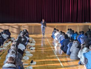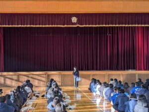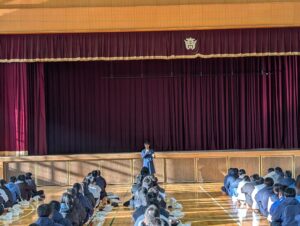 修学旅行委員長の挨拶では、「一歩踏み出して、新しいチャレンジをしよう」という話をしていただきました。