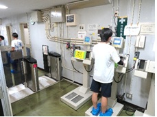 講演の後はいよいよ原子炉の見学です。しかしその前に、担当者から見学時における持ち込み物の確認や注意事項とともに放射線の被ばくを測定する線量計がグループに1つずつ配られました。原子炉の建物に入る前にも被ばく量の測定とオーバーシューズの着用が義務付けられました。減圧された原子炉建屋の中に入り、いざ原子炉を目の前にすると、さすがに緊張が高まり、心臓の鼓動が高まったのを思えています。私たちが訪れたときは原子炉が稼働していない時間帯でしたが、その緊張感は痛いほど伝わってきました。テレビなどを通して私たちが良く目にするのは発電用の原子炉、いわゆる原子力発電所とは少し違い、私たちが目にしているのは出力の小さな研究用の原子炉でした。それでも十分に大きく、放射能の危険性に違いはないと聞きました。さらに驚いたのは、原子炉の周りを取り囲むように研究室が配置され、原子炉から作り出される中性子を使って実験が行われていることでした。