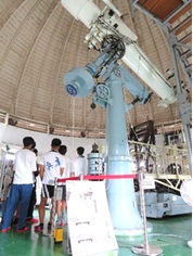 午前中は、花山天文台を訪れました。ちょうど清水寺の裏山の山中に天文台はあります。京都大学には3つの天文台がありますが、花山天文台は最も古く1929年に設置された歴史と伝統ある天文台です。観測の主力は飛騨や岡山天文台へ移りましたが、花山天文台では現在でも太陽物理学や恒星物理学などの研究が続けられているそうです。国内の屈折望遠鏡としては3番目の大きさを持つ45㎝望遠鏡が本館に、現役としては日本最古の18㎝屈折望遠鏡が別館に置かれ、それらを用いながら研究者の方々に解説をしていただきました。2つともとても古い望遠鏡なので、今でも手動で稼働させたり、おもりを用いて半自動で稼働させたり、現代ではある意味時代遅れとも思える方法で研究が行われていたのには驚かされると同時に、そのような機材でも充分最先端の研究ができるのだということに驚かされました。