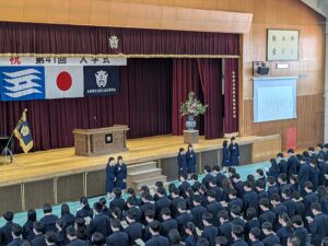 午後の入学式では、新たに本校の門をくぐった41回生が、緊張感の中にも希望を胸に秘め、凛とした態度で式に臨みました。校長式辞では、クラーク博士の言葉「Boys, be ambitious」が紹介され、高い志を持ち、自らの可能性に挑戦し続けてほしいとのメッセージが新入生に贈られました。春風に舞う桜の花びらとともに、この言葉は41回生一人ひとりの心に深く刻まれたことと思います。