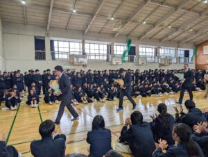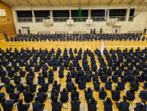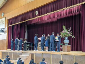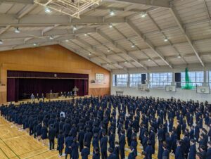 続いて、今春異動される先生方の離任式が行われました。式では、離任される先生方からご挨拶があり、これまでの学校生活を温かく振り返るお話や、生徒への励ましの言葉が語られました。挨拶の中ではサクラの独唱も披露され、会場は穏やかで心に残るひとときとなりました。先生方からいただいたお言葉を胸に、これからの高校生活をより充実したものにしていってほしいと思います。