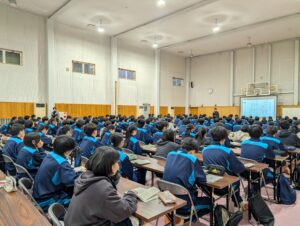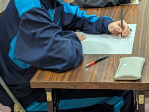 オリエンテーション合宿 学習①国語、学習②数学 夕食後、サンダイフク体育館にて国語と数学の学習を行いました!本日最後の活動です。 日中の学年活動の疲れもある中でしたが、最後まで真剣に学習に取り組んでいました。