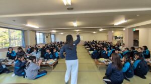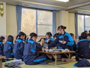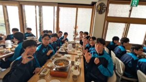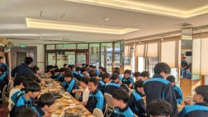 2日目の夕食はすき焼きです。食堂に入った瞬間から、生徒たちは歓声を上げ、笑顔が広がっていました。疲れも感じさせないほど、活気のある食事の時間となりました。