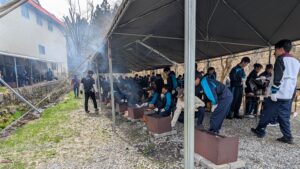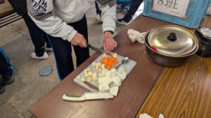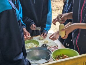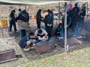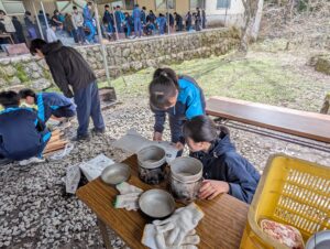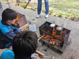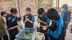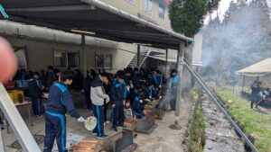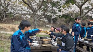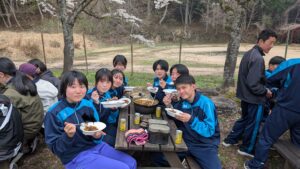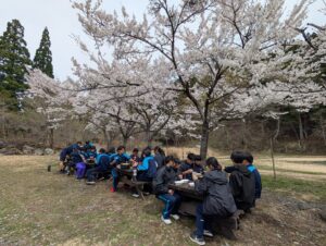 出来上がったグループから、桜の木の下でお花見をしながら食べています!