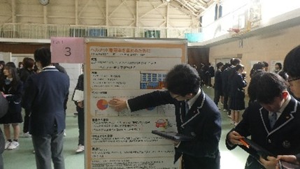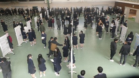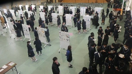 第1部では、2年普通科による探究発表および2年STEAM探究科による探究発表を行いました。第2部では、1・2年生による全89班のポスターセッションを実施しました。生徒たちはこれまで取り組んできた研究成果を発表し、互いに質問やコメントを交わしながら理解を深めました。発表者と聞き手の双方向のやり取りが活発に行われ、今後のさらなる探究につながる有意義な機会となりました。