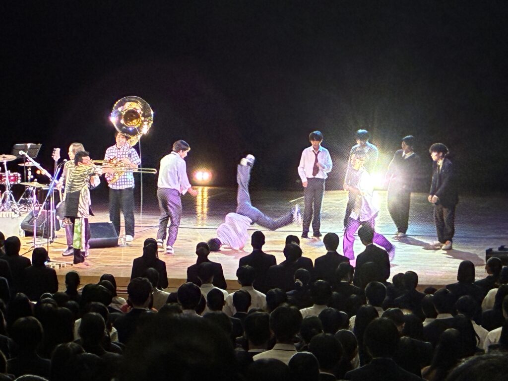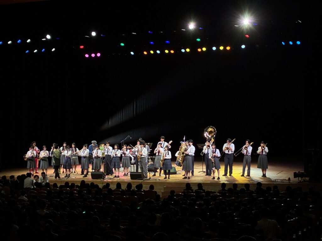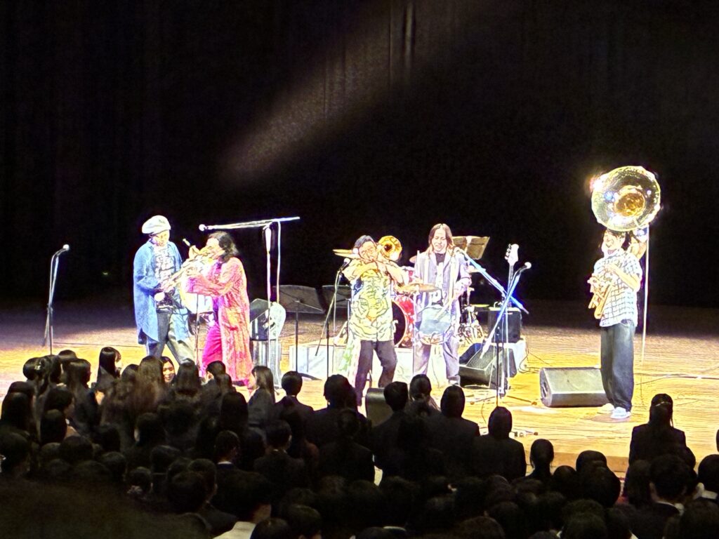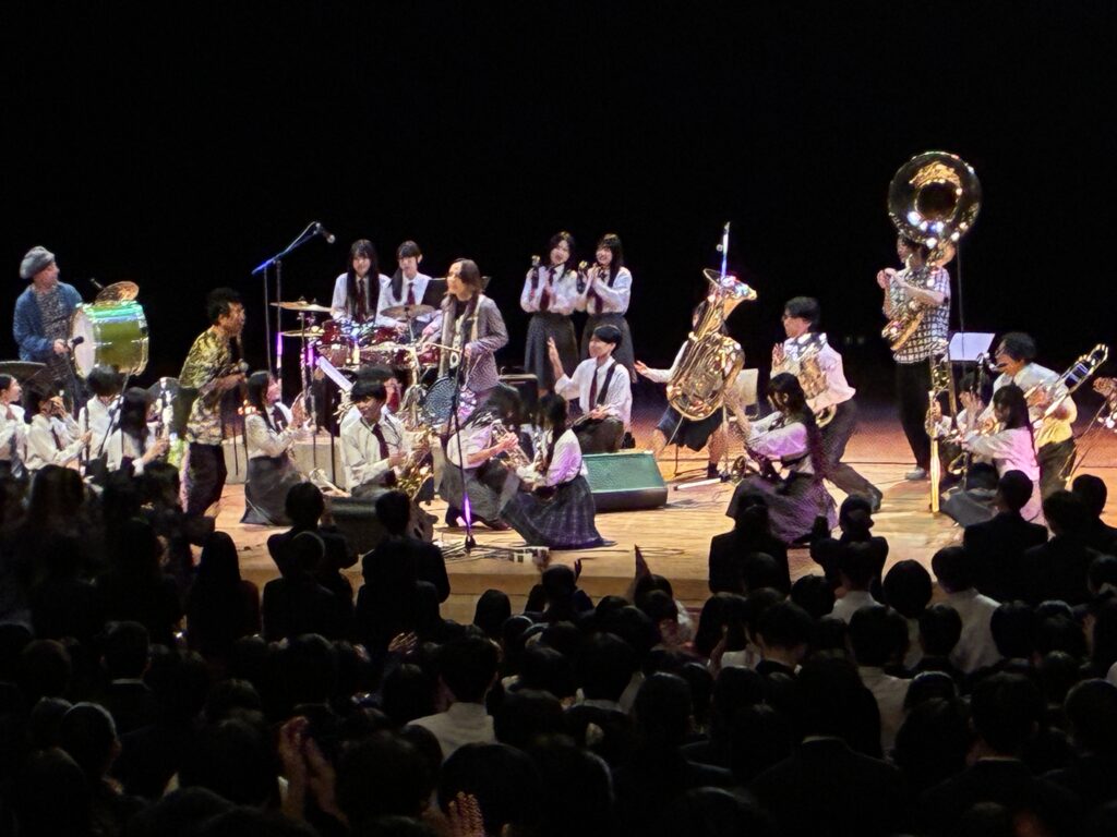 オリジナルソングに続いて「sing sing sing」や「Change the World」などのスタンダードナンバーなどを聴いたり、会場が一体となってリズムを感じて体を動かしたりと大盛り上がりとなりました。また後半はブラスバンド部と「聖者の行進」などで共演を楽しみました。プロの音色に酔いしれた秋の一日となりました。