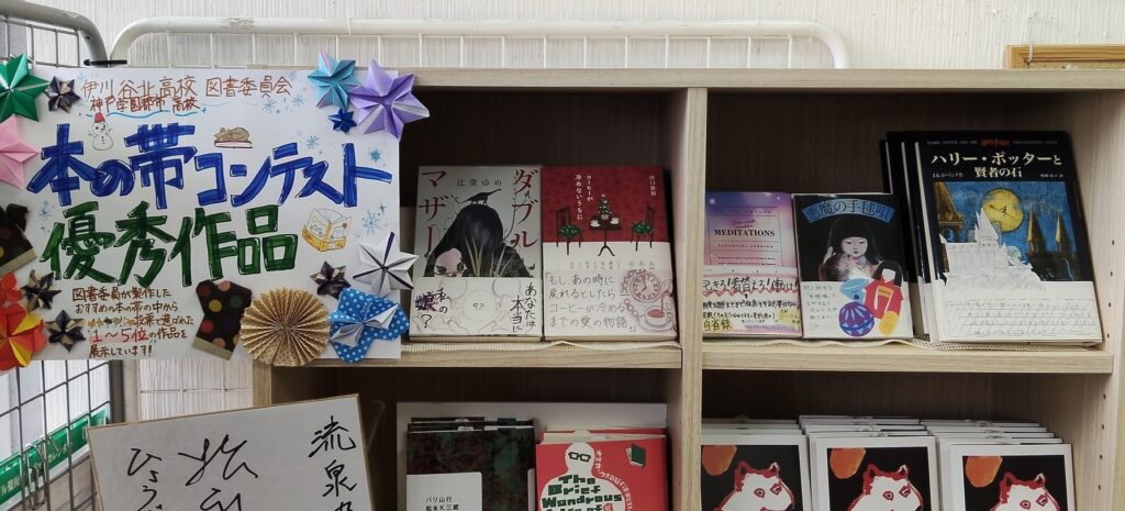 校内で本の帯コンテストを行いました。心をつかむキャッチコピーやイラスト、心に残ったセリフなどを入れて工夫を凝らした本の帯を図書委員の人たちが作成しました。それを校内で投票してもらった結果、優秀作品を流泉書房さんのフェア台に飾っていただいています。