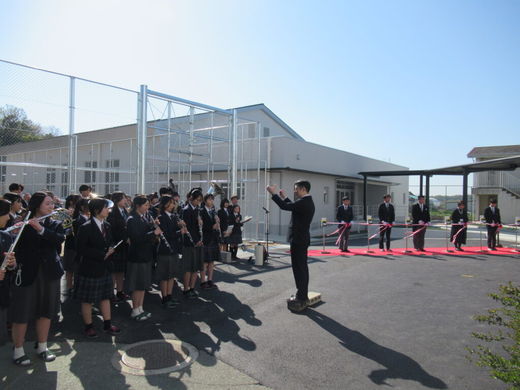続いて行われたテープカットセレモニーでは、来賓および代表生徒が並び、吹奏楽部の演奏が響く中、華やかに執り行われました。合図とともにテープが切られると、会場は大きな拍手に包まれ、講義棟の完成を祝う象徴的な瞬間となりました。その後、記念撮影も行われ、節目のひとときを共有しました。
