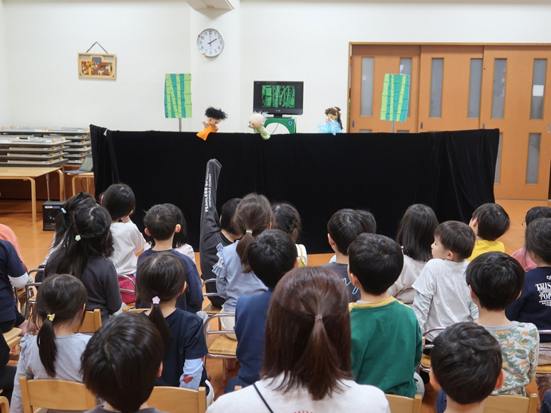 3月25日(水)に西区のYMCA保育園で人形劇「西区竹取物語」を公演しました。5歳児約70名が参加、終始笑顔の絶えない楽しい公演になりました。終了後は人形とふれあったり、手を挙げて感想を伝えてもらったりしながら交流を深めました。