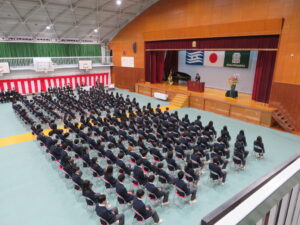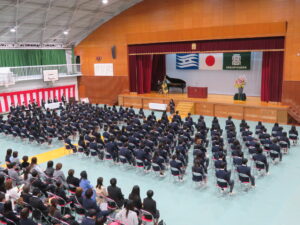 卒業式 2026年3月4日 令和8年2月27日に第48回卒業証書授与式が来賓の方々、保護者の方々、二年生の代表者、教職員が見守る中、厳粛に挙行されました。卒業生たちの門出にふさわしい良いお天気となり、式後も校門でいつまでも別れを惜しむ姿が見られました。 校長祝辞 送辞 答辞