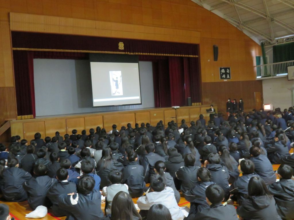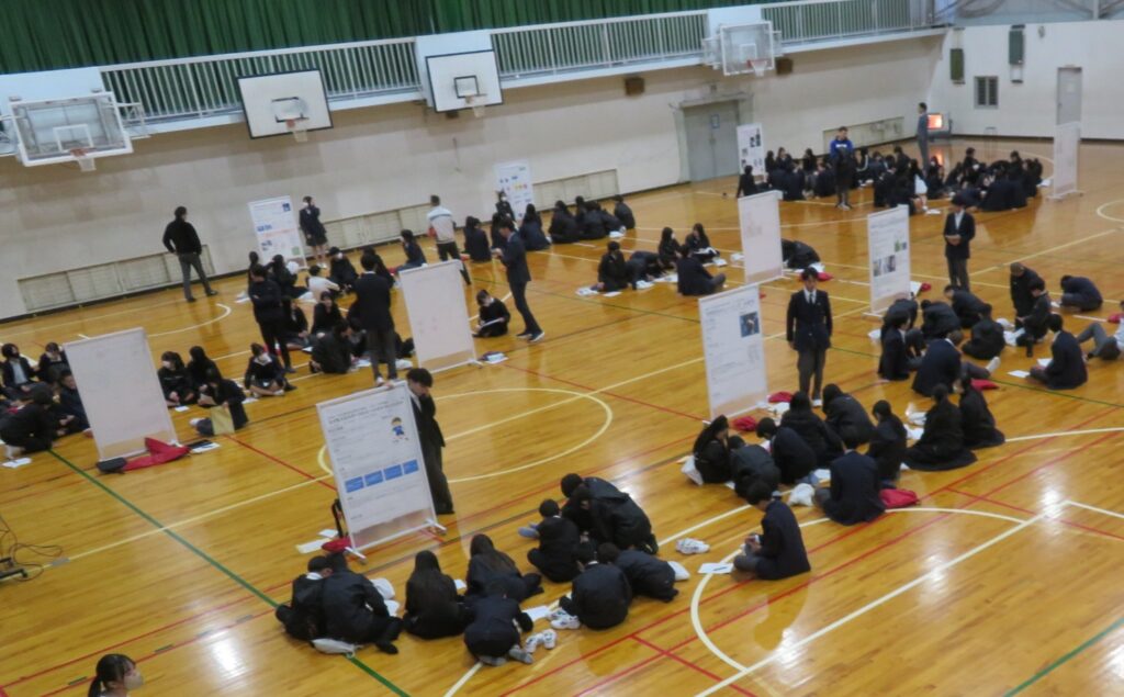 3月10日(火)に課題研究発表会が実施されました。今年度は神戸市立長坂中学校の一年生を招いて、本校二年生全員が一年間にわたって準備してきた成果を発表しました。特色の生徒の動画発表に引き続き、体育館では、ポスター発表、探究ルームではタブレットによる発表、教室ではプロジェクターやテレビモニターによる発表に分かれて実施しました。各ブース15分間で発表、質疑応答を行い、発表者は第1ピリオドから第6ピリオドまで計6回発表しました。回を重ねるごとに会場全体が和んできて、発表する側は調子が出てくると同時に、聴く側もするどい質問が出せるようになりました。中学生の目をまるくして聴く姿も新鮮で、本校の生徒も顔を見ながら、時に問いかけながら、丁寧に説明していました。