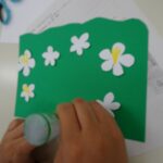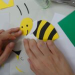 授業では『ぶんぶんぶん』の童謡をテーマに、歌詞の中の情景をもとに「貼り絵」に表す平面構成を学びました。蜂の脚はどこから生えているのか、野ばらの花びらの色は何色なのかなど、自然で違和感のない表現や、全体の調和を大事にすることを、先生から丁寧にご指導いただきました。