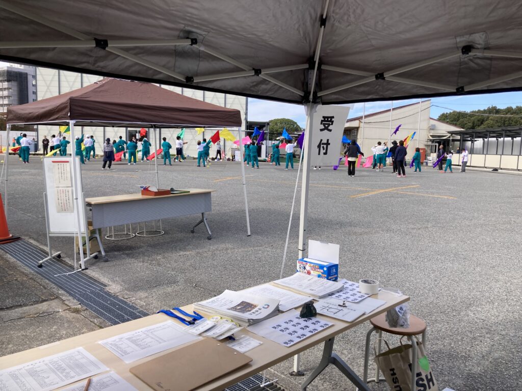 新校舎の建て替えに向けて基礎工事(地盤改良など)の準備・調査も始まりました。新校舎への引っ越しは約2年後を予定しています。それまでは、現在のように狭い校内を3学部で分け合って使っていく感じです。でも、その分だけ、お互いの存在がしっかり意識できています。この日も事務室前の広場で旗練習する高等部生徒の様子を横目に見ながら、運動場に向かう小・中学部生の様子がありましたよ。
