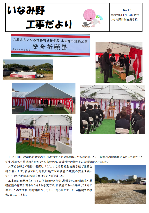お知らせ 全校 工事について 工事だよりNo.13ができました 2025年11月18日 いなみ野 ブログ 長い間、ストップしていた工事が再開されます。 いなみ野工事だよりNo.13 251113ダウンロード