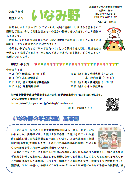 支援部 2026/01/05 支援部 地域支援だより「いなみ野」No.8 2026年1月8日 いなみ野 ブログ 地域支援だよりNo.8を発行しました。 学習の様子と、書籍の紹介を載せています。 ぜひご覧ください。 R7地域支援だよりNo.8ダウンロード