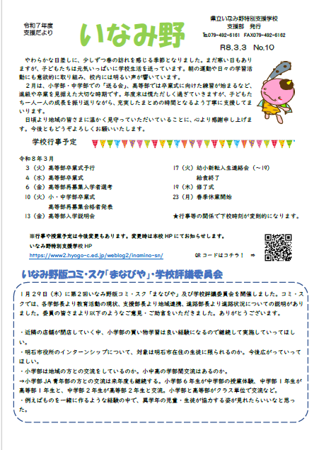 支援部 2026/3/3 支援部 地域支援だより「いなみ野」No.10 2026年3月3日 いなみ野 ブログ 地域支援だよりNo.10を発行しました。 学習の様子と、支援のコツの紹介を載せています。 ぜひご覧ください。 R7地域支援だよりNo.10ダウンロード