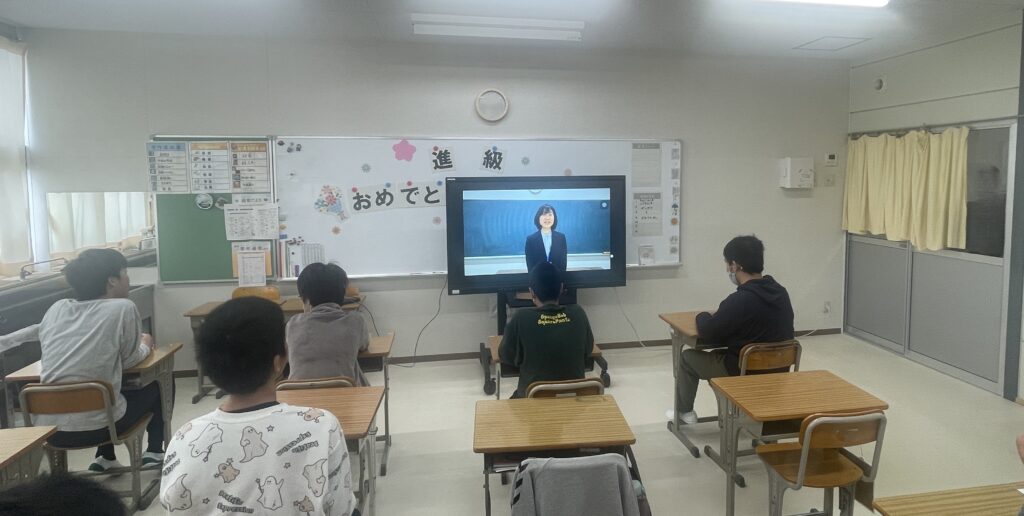 また、着任式では、今年度新たに本校へ着任した職員の紹介があり、画面に映し出される先生方の姿を、生徒たちは興味深そうに見つめていました。