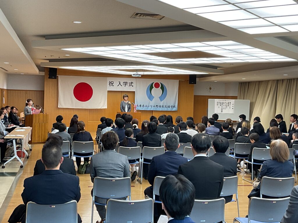 4月8日(水)に、稲美町役場新館コミセンホールをお借りして、小学部39名、中学部28名、高等部34名の入学式が行われました。校長先生や来賓の皆様がご臨席され、お祝いの言葉を頂きました。新入生の皆さんは、新しい学校生活でたくさんの同級生と初めての行事を共に楽しく毎日を過ごしてほしいと思います。