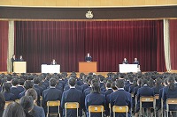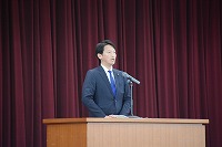 兵庫県知事 斎藤元彦様をお迎えし、グラウンド人工芝の完成式典を体育館で行いました。式典では、知事や工事関係者の皆さまからご挨拶をいただき、人工芝の完成を祝いました。