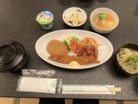 今日の夜ごはんは、ハンバーグ、エビフライ、ナポリタン、コロッケ、サラダ、ポトフ、マカロニ、ラーメン、ヨーグルト、白ごはんでした。栄養満点で、ボリューミーでとてもおいしくて、疲れが吹っ飛びました。明日も1日みんなで協力して仲を深めて楽しみます!